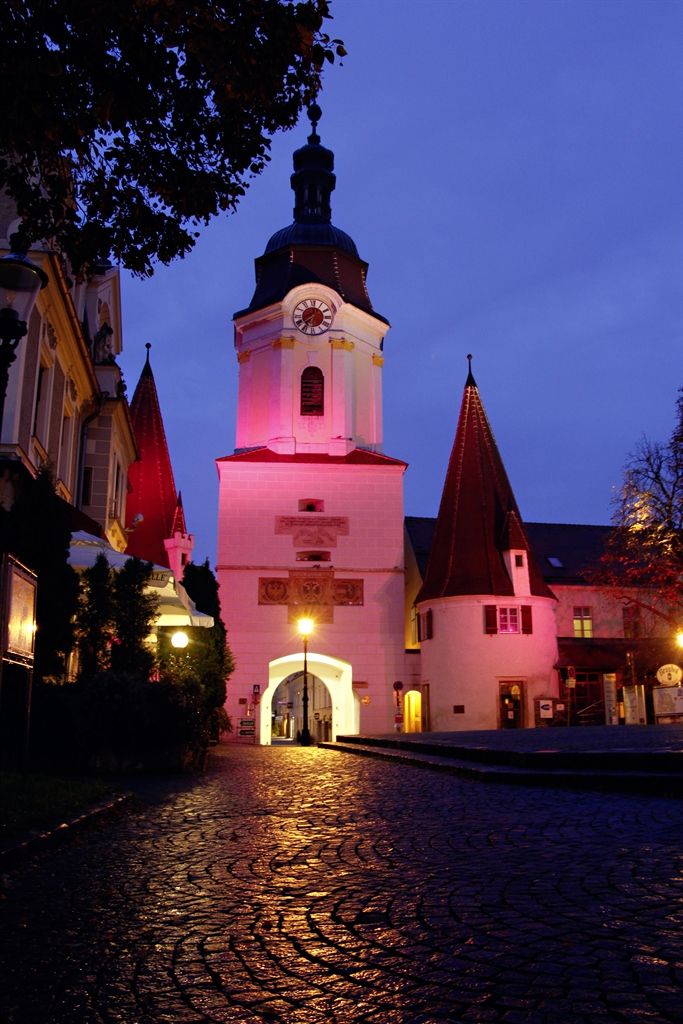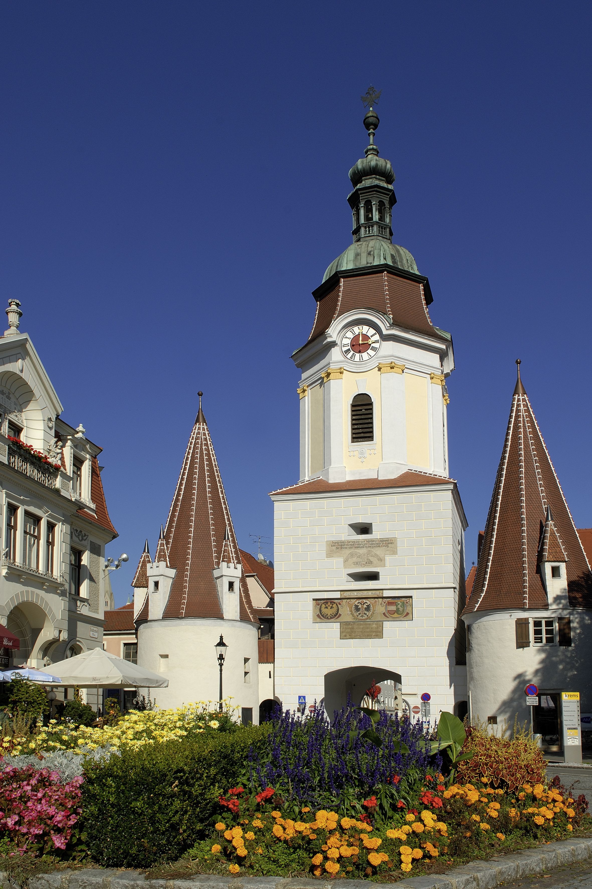 The Steiner Tor is the landmark of Krems and the only remaining of the four former town gates. The main tower from the late 15th century bears a series of inscriptions on the outside, including the motto AEIOU (All the earth is subject to Austria) in memory of Frederick III. Three coats of arms from 1756 adorn the entrance to the city, on the left the one granted by Emperor Frederick III and still valid today, which shows the crowned double-headed eagle on a black background, on the right the coat of arms of Ladislaus Posthumus, in the middle the coat of arms of Maria Theresa.