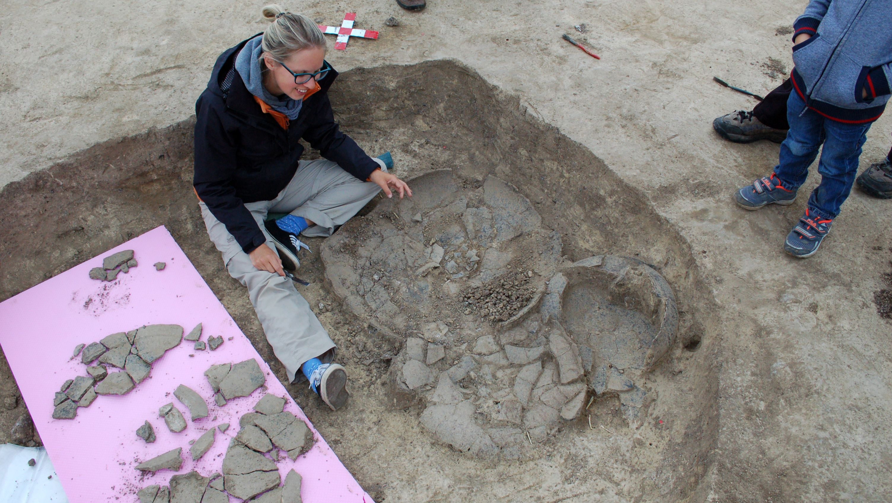 Immediately to the west of the widely visible burial mound, a low mound can be seen that originates from a second, much smaller burial mound. The archaeological investigation of this burial site, the so-called "Tomb of the Queen", took place in the 1950s and documented the remains of wooden grave structures. Although already raided by robbers in ancient times, numerous clay vessels, including some with attached bull heads, were recovered from the tomb. One of the most impressive finds is a sculptured figure of a rider and horse. In the nearby "Totenweg" field, excavations were carried out in the settlement belonging to the burial mounds. The most prominent find here is a so-called "Mondidol", probably a fire ram with ram's head and sun wheels.