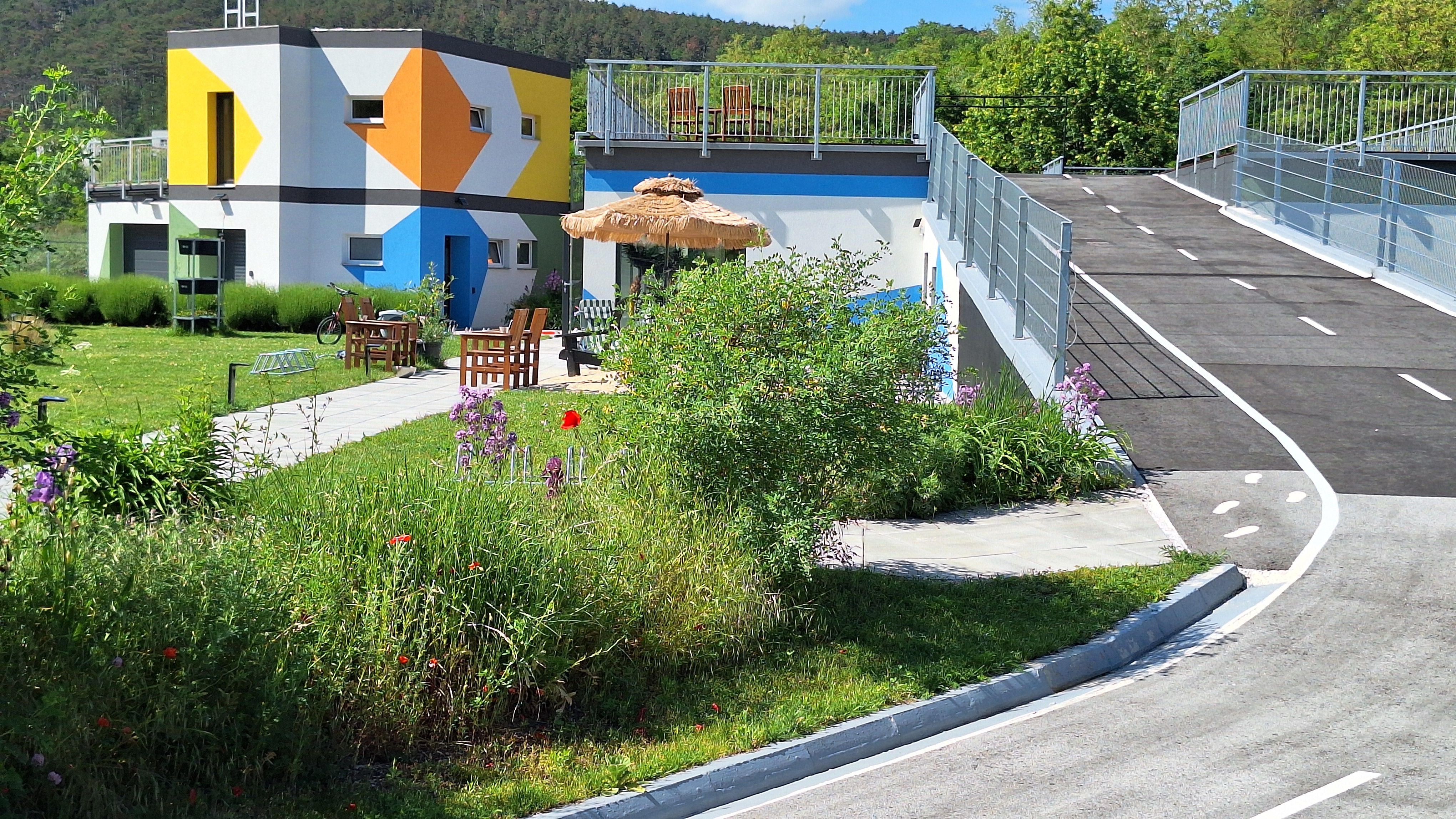 Discover a beautifully designed rest area surrounded by greenery, right next to the Triestingtal cycle path and opposite the "Berndorf-Fabrik" train station.