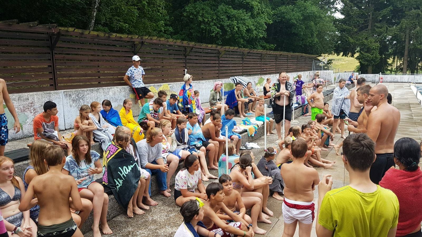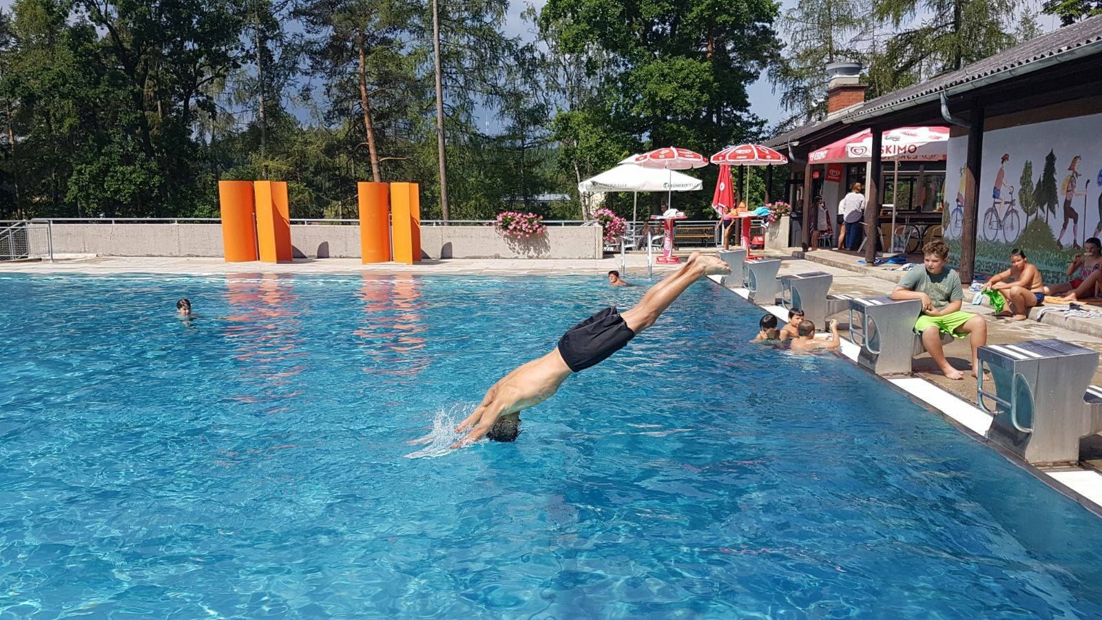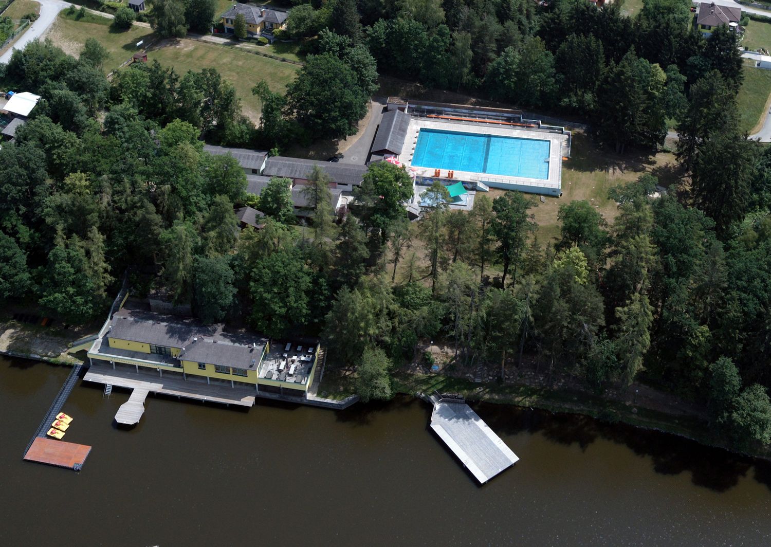 Heated sports pool, children's pool, large sunbathing lawn, buffet, play facilities, changing rooms, WC, water slide, water playground