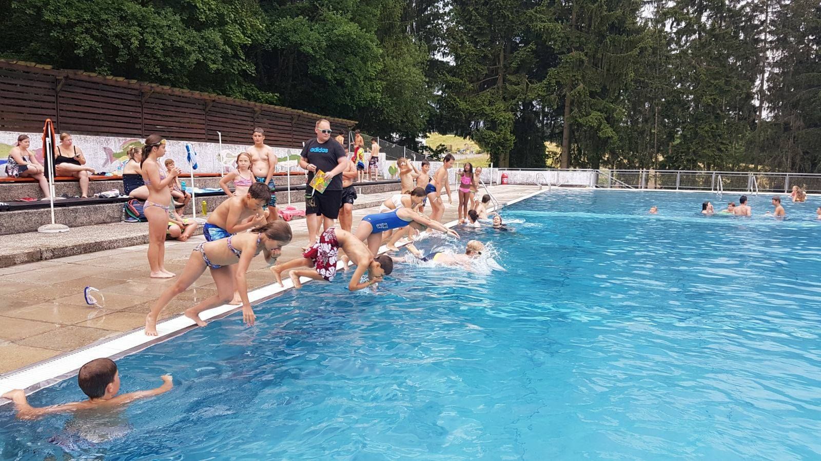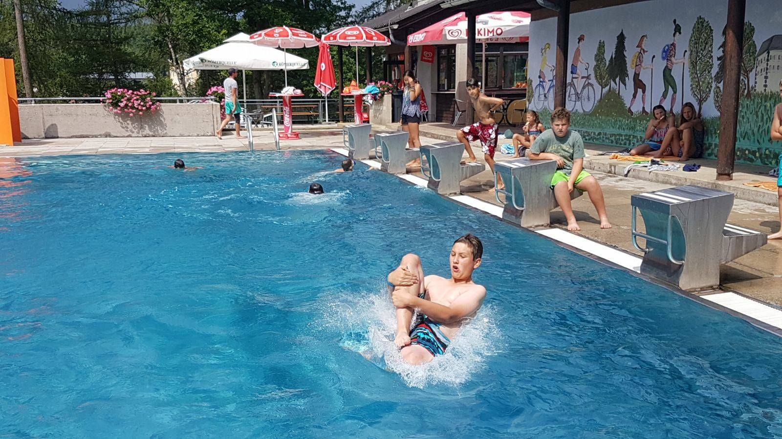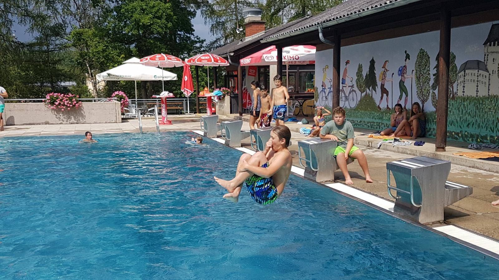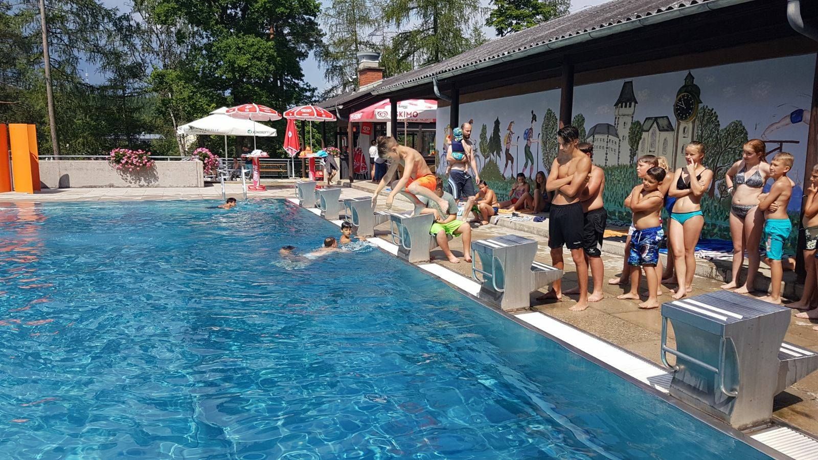 Heated sports pool, children's pool, large sunbathing lawn, buffet, play facilities, changing rooms, WC, water slide, water playground