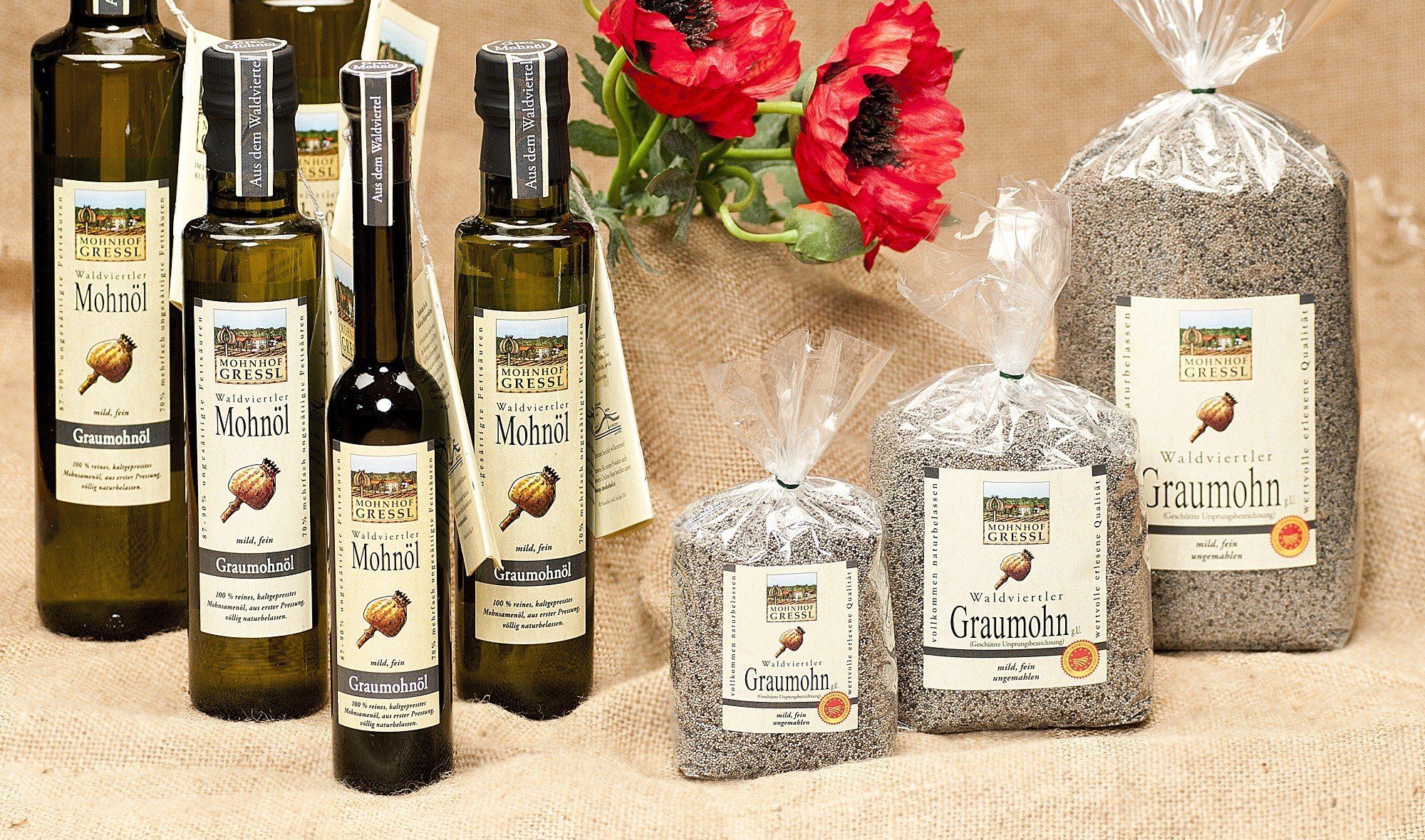 The Waldviertler Mohnhof is a small family-run farm that has specialized in poppy cultivation for 30 years and produces cold-pressed, high-quality poppy seed oils from grey, blue and white poppies. You are always welcome to visit the lovingly furnished poppy store. In addition to poppy seeds and poppy seed oils, Mohnhof Greßl also offers many other poppy seed-related products, such as poppy seed capsules, poppy seed oils and poppy seed oil: Poppy seed capsules, poppy seed oil soaps, poppy seed brandy, poppy seed oil creams,.... as well as many nice gifts for friends, relatives, business partners - or simply give yourself a present!