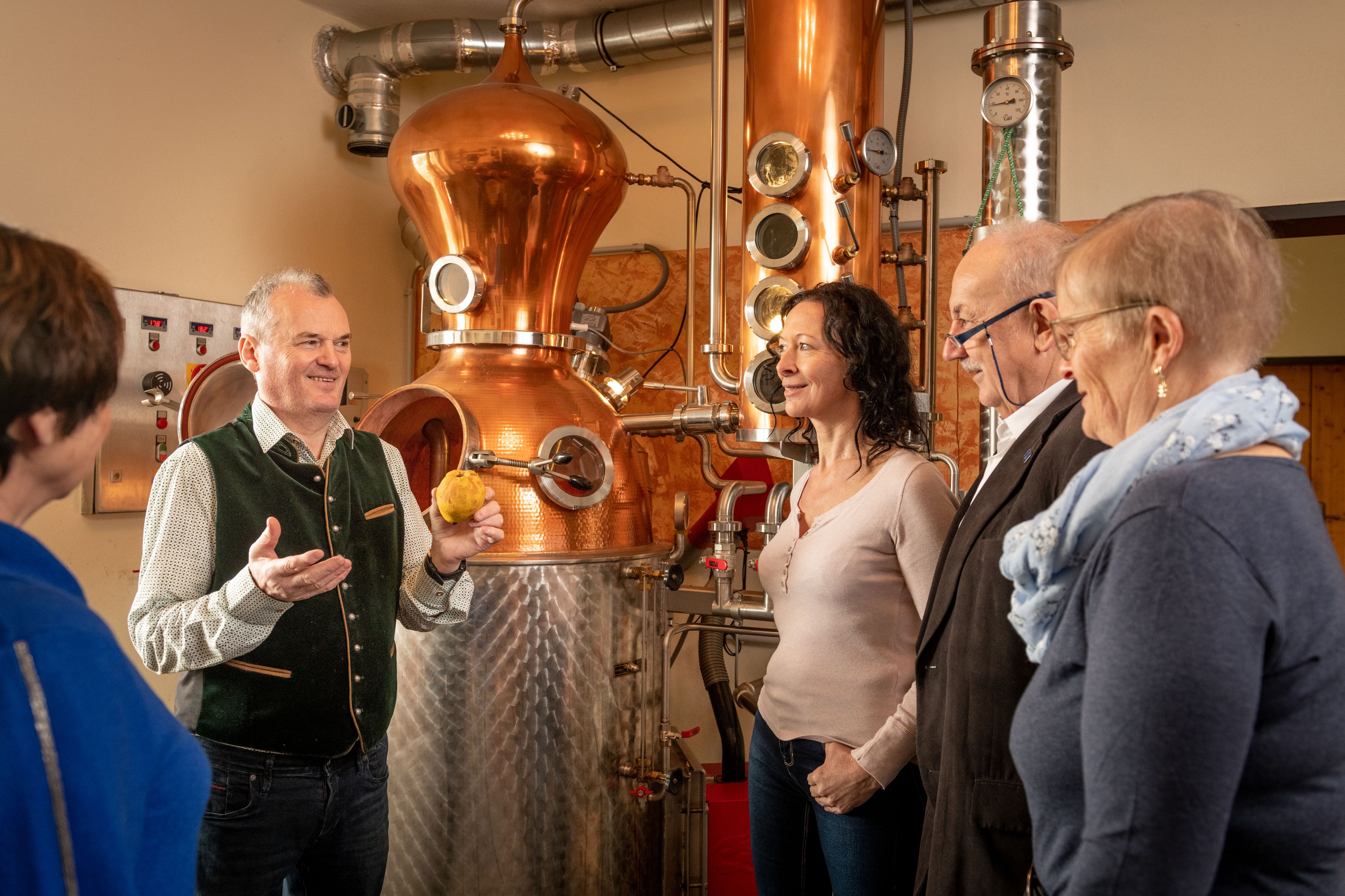 The tour continues to the distillery. Here you can marvel at the distillation facilities up close, as well as the storage and production rooms. In the tasting room, 3 samples of fine brandy are then tasted. During this entertaining tour, you will gain an insight into the different types of fruit in the region, the harvesting and processing of the schnapps, as well as a professional tasting of schnapps.