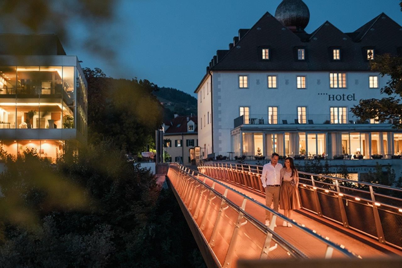 The panoramic windows of the castle restaurant high above the banks of the Ybbs provide idyllic impressions. The castle terrace provides space to enjoy the sunshine outside in summer and capture the atmospheric ambience of the romantically illuminated Schloss Rothschild in the evening.