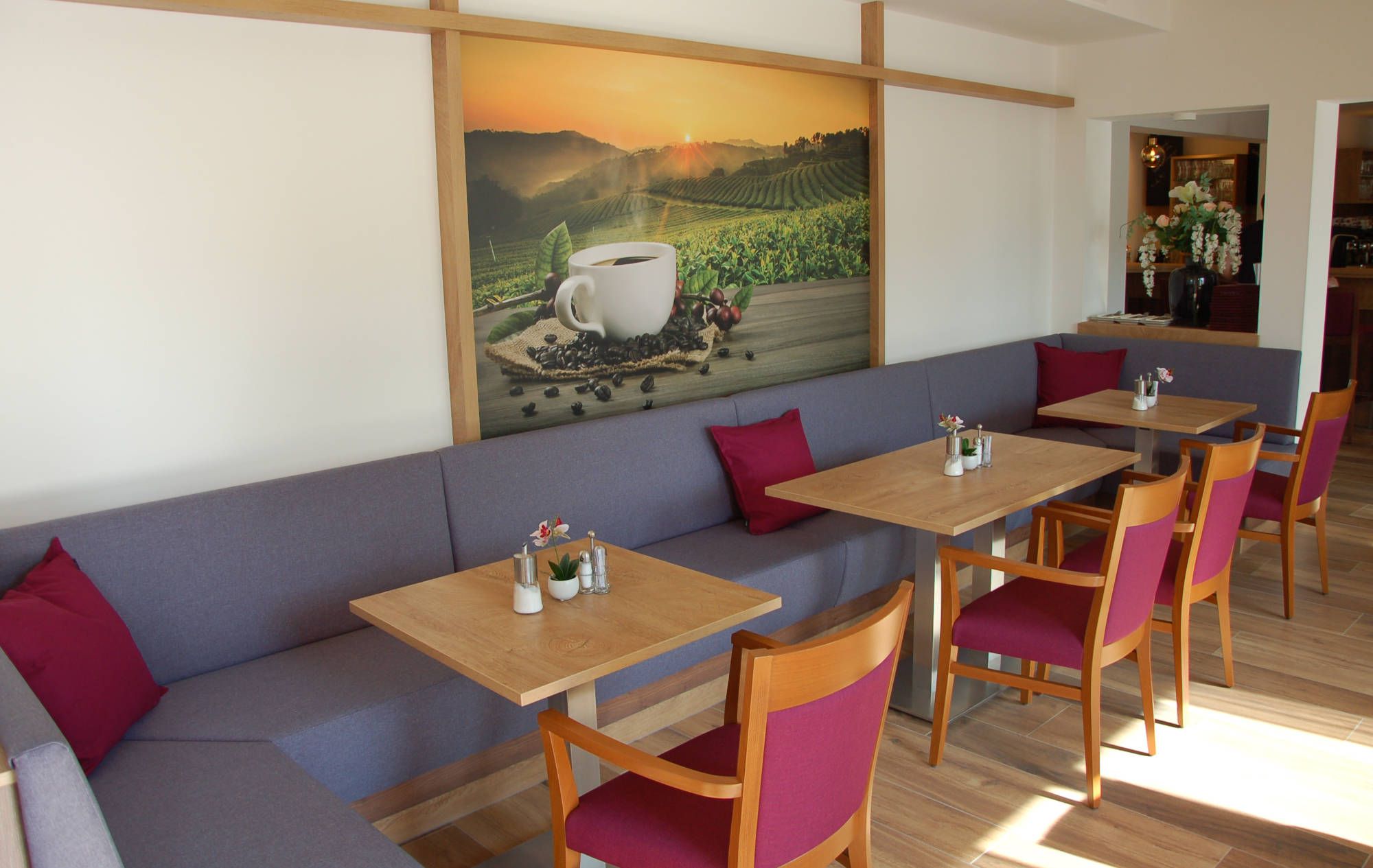 The restaurant presents itself as modern and cosy, with an appealing interior - ideal for coffee, food or a glass of wine in a relaxed atmosphere. The rural location at the intersection of Kamp Valley ("Kamptal" in German) and Wachau makes the inn an ideal destination for hikers, wine lovers and day guests.