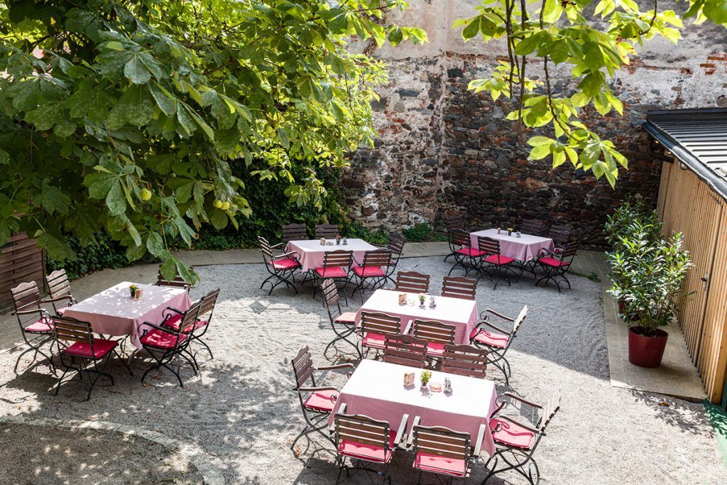 The idyllic, shady inner courtyard under an old chestnut tree is the perfect place to relax with a glass of wine or regional beer - a little oasis away from everyday life.