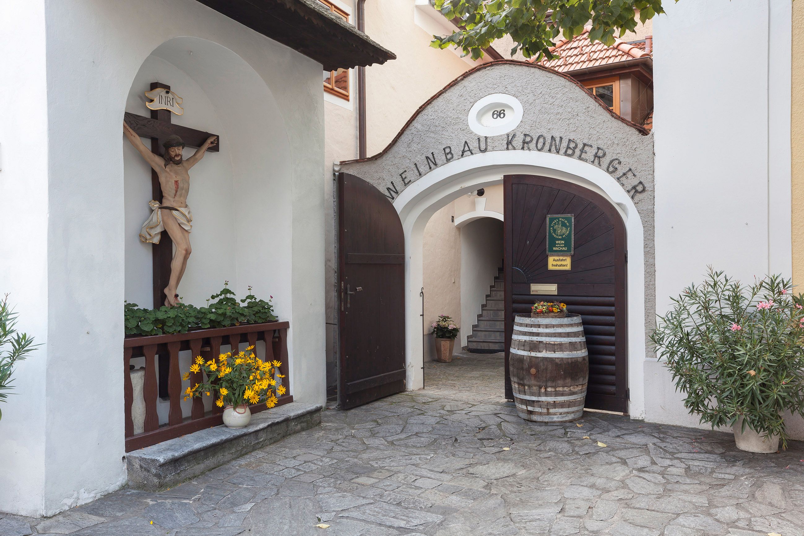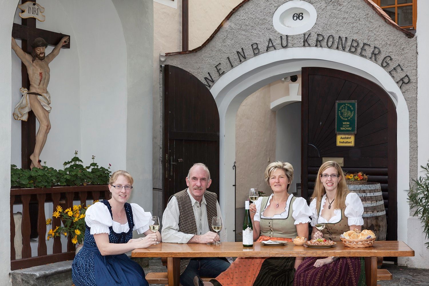 The house on the market square in Wösendorf, where the Kronberger family's winery is located, looks back on an eventful history. Where Veltliner and Riesling have been pressed for a few generations, there has been a women's mine, butcher's shop, school and smithy in its 600 years of existence. Today, you can enjoy the cozy atmosphere of one of the most beautiful Buschenschank (typical tavern) in the Wachau under the impressive and well-preserved barrel vault. The wine comes from vineyards stretching from Joching to St. Michael, and even if there are only a few kilometers between the Jochinger Berg vineyard, the famous Kollmütz and the Harzenleiten, there are still a lot of geological and climatic differences.