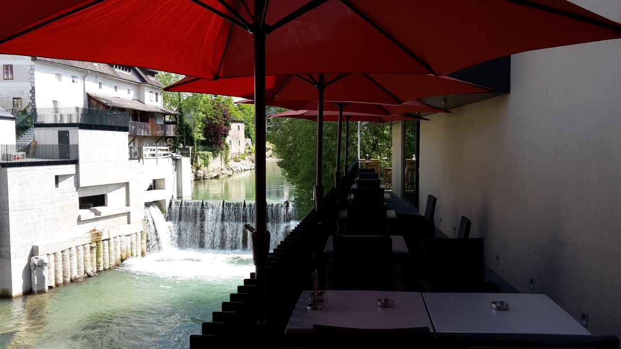 A first glance from La Terrassa in Purgstall into the depths shows a several meter wide Erlauf with green-blue to turquoise water, lined on both sides by rocks that disappear under the dense green dress of the trees.
