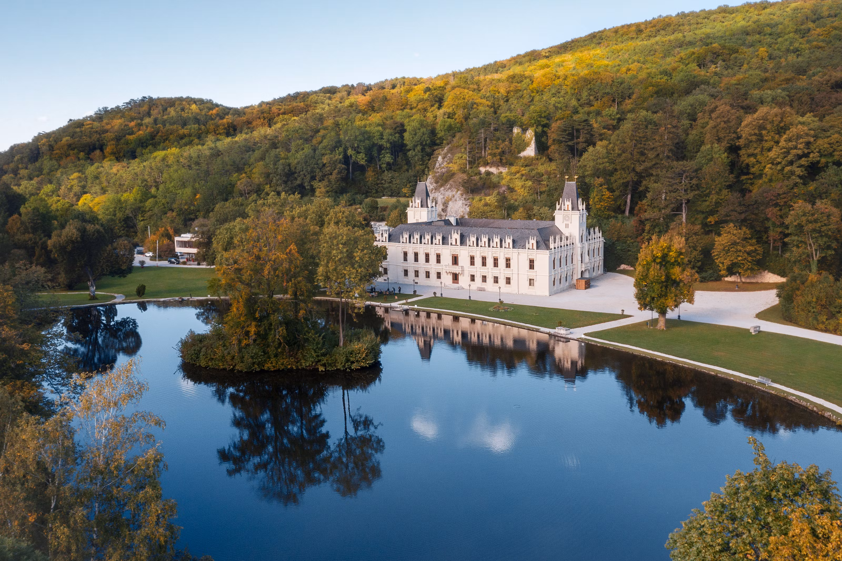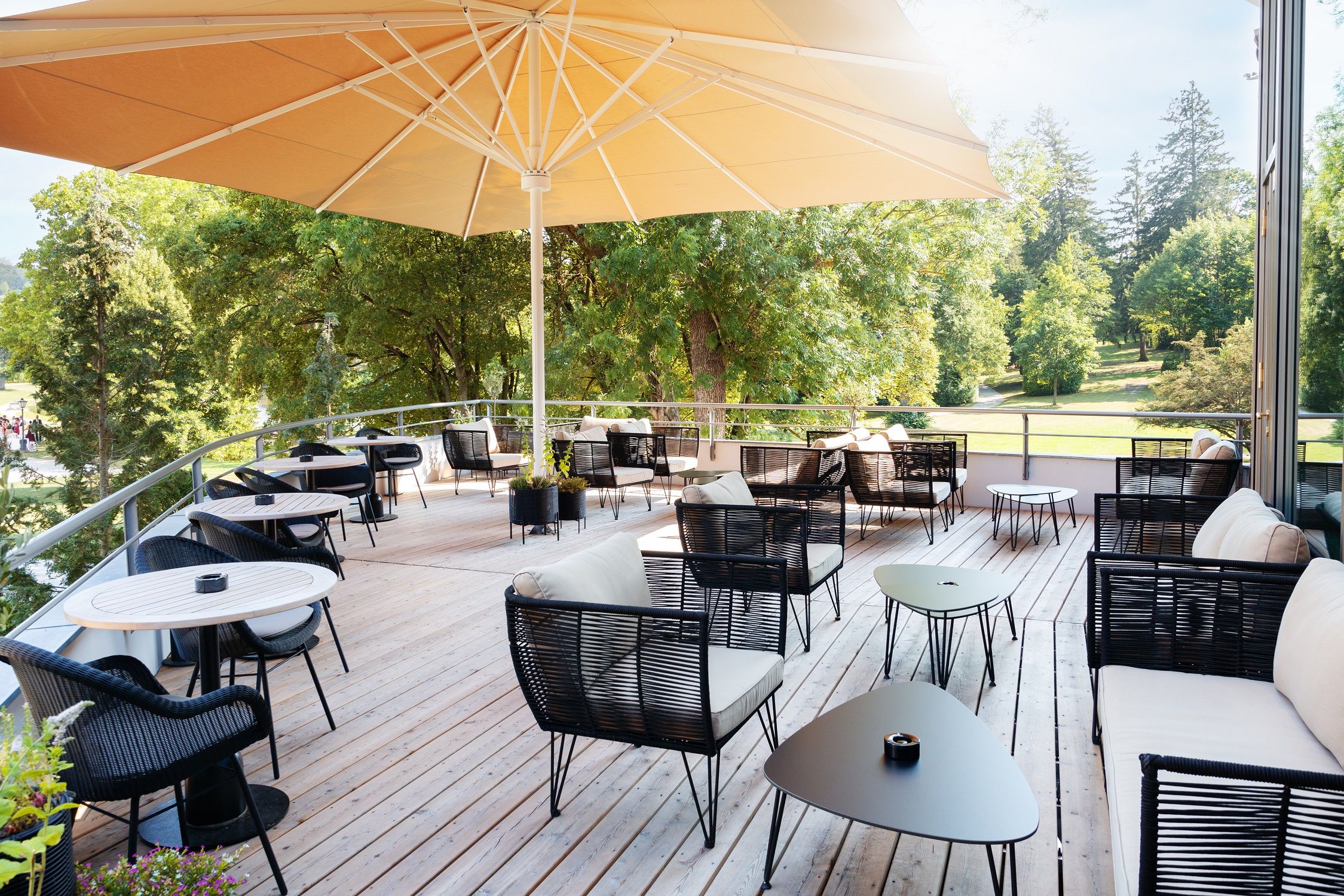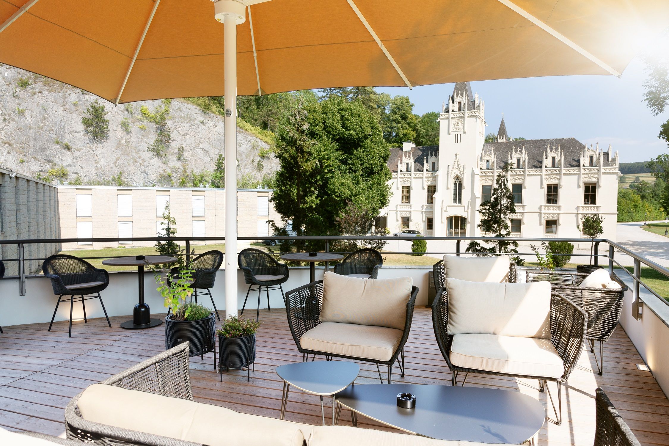 The contemporary style in a darker interior design picks up on the colors of the surrounding nature and symbolizes the bridge between the historical past and the new exterior appearance. The balance of room temperature, light, scent, music and not least the culinary delights creates a relaxed atmosphere that invites you to enjoy hours of pleasure and has a positive stimulating effect on all the senses.