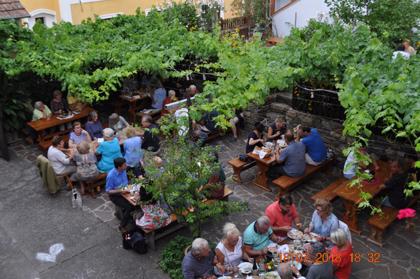 The inner courtyard, framed by vines and partly covered by a pergola, offers a pleasant climate for enjoying Wachau wine in the open air well into the evening.