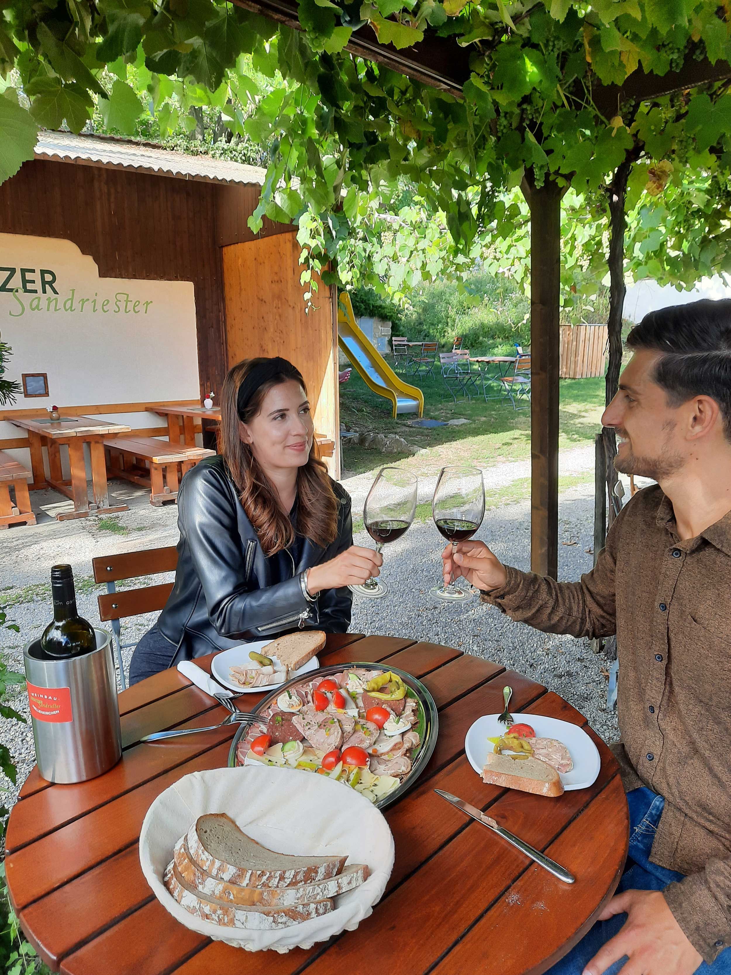 Our Buschenschank (typical tavern) is located in the wine cellar lane of Prellenkirchen, 2km outside of Edelstal - the neighboring village - at the foot of the Spitzerberg between vineyards and rolling grain fields. The cellar was built in the 17th century and has been owned by our family since 1924. We not only offer selected quality wines from our vineyards in the Carnuntum region, but also hearty and tasty dishes such as roast pork, roast pork, sausages and smoked meats, all from our own slaughterhouse. Various cheeses, spreads and sweet delicacies based on grandma's recipes such as "Hausfreunde" and "Schmerstrudel" complete our extensive range of food and drink.