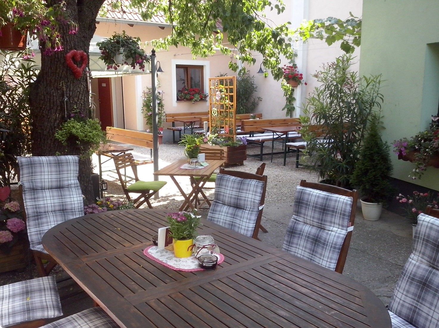 A traditional wine tavern awaits you during your visit! Regularly among the best-rated wines in the region, the red Burgundy varieties, St. Laurent and Pinot Noir, are the focus of our viticultural efforts. Multiple awards in the renowned Falstaff magazine testify to the quality of the wines produced here. The wine tavern: Our wine tavern has not lost its originality in the traditional wine tavern culture. In addition to wines such as St. Laurent, Zweigelt, Blauer Portugieser, Pinot Noir and Chardonnay, which can be served and tasted, we offer our guests a typical Heurigen buffet with home-made delicacies such as black pudding, roast pork, various spreads and salads as well as seasonal delicacies such as mozzarella with tomatoes and seed oil, beef variations, game pâté, etc. The cozy Heurigen restaurant offers space for 80 people. Another 80 people can be served in the garden and courtyard in summer. One of our specialties is that the whole family - from the children to the grandparents - takes care of the personal attention of our guests. We are all committed to your satisfaction and look forward to your visit!