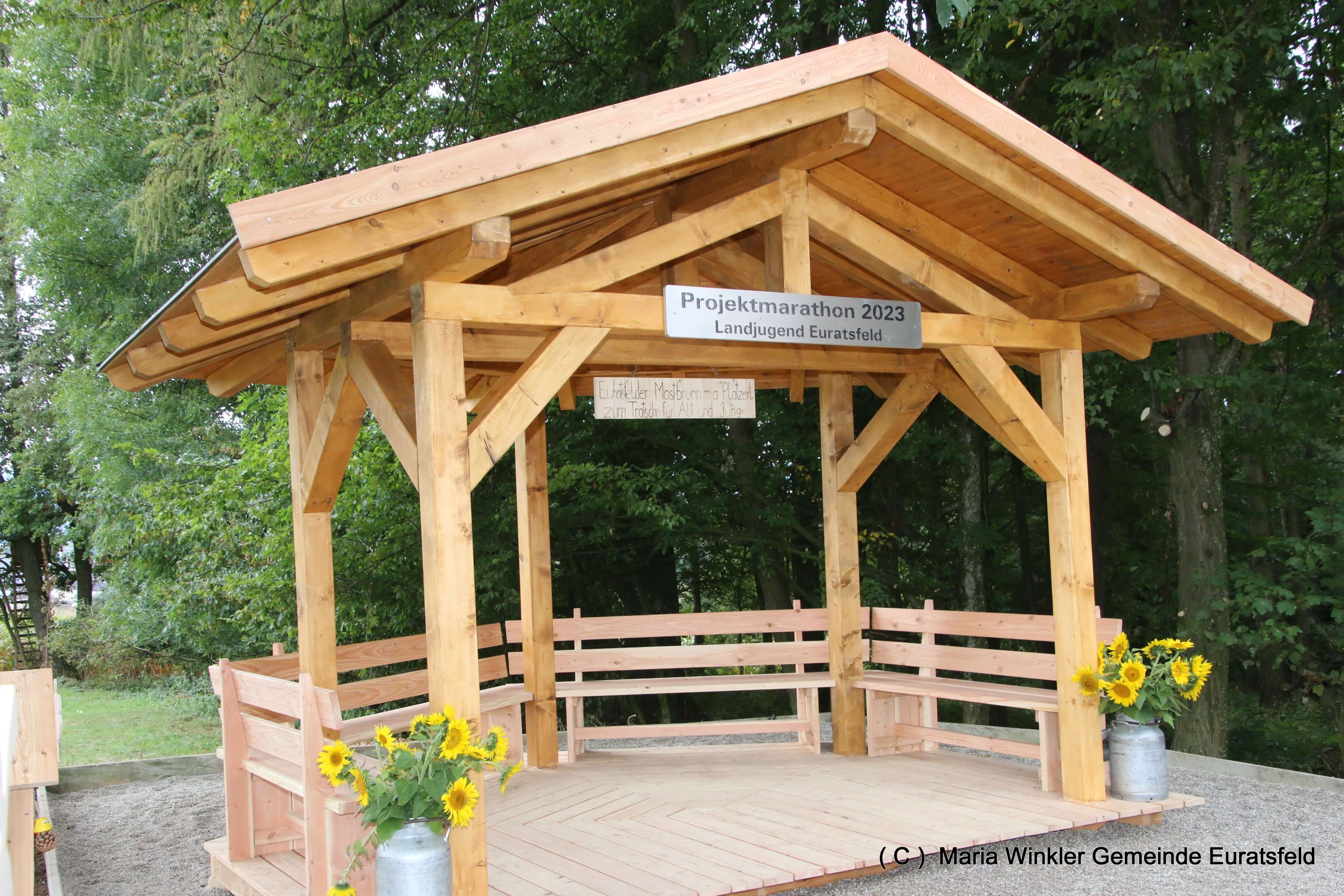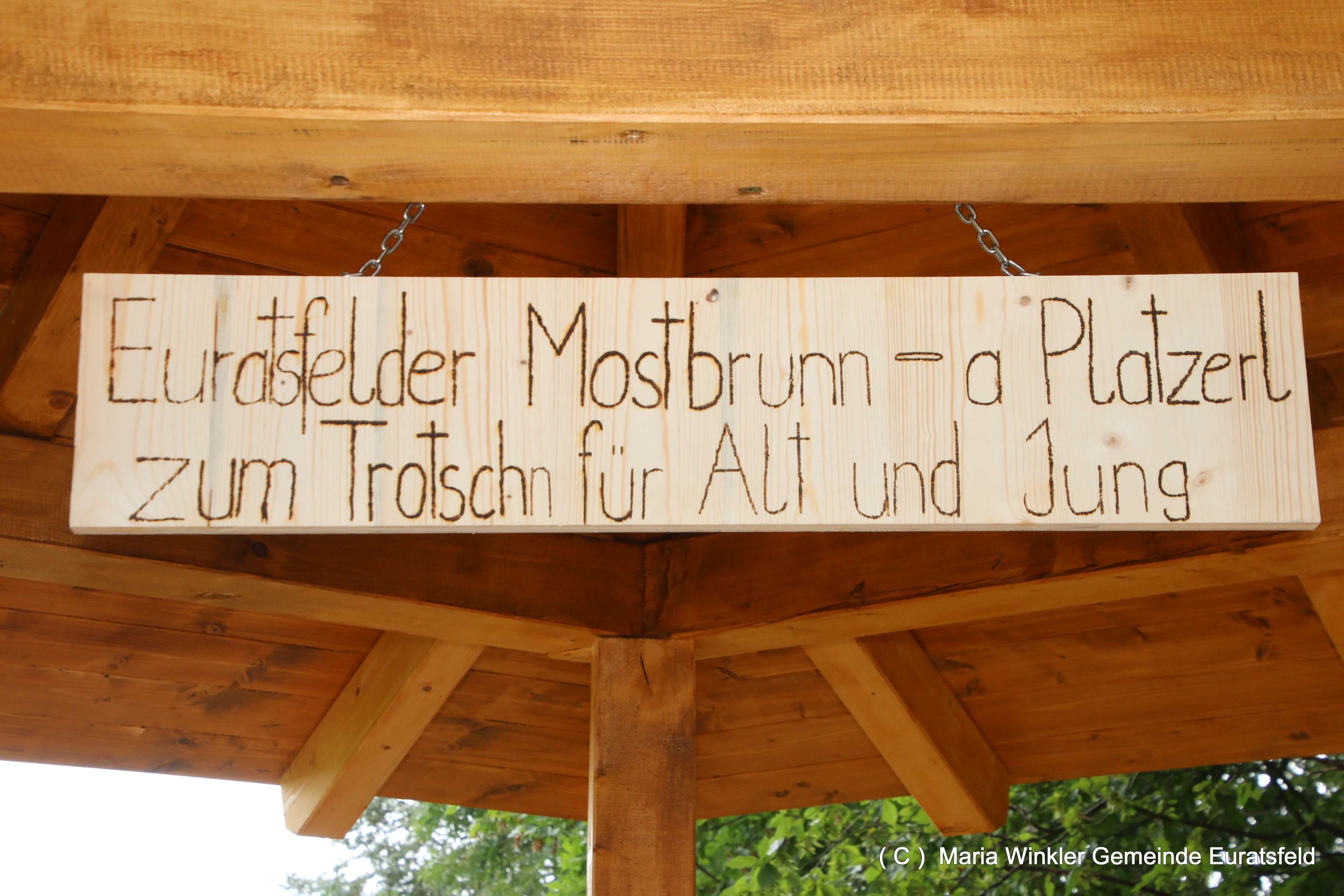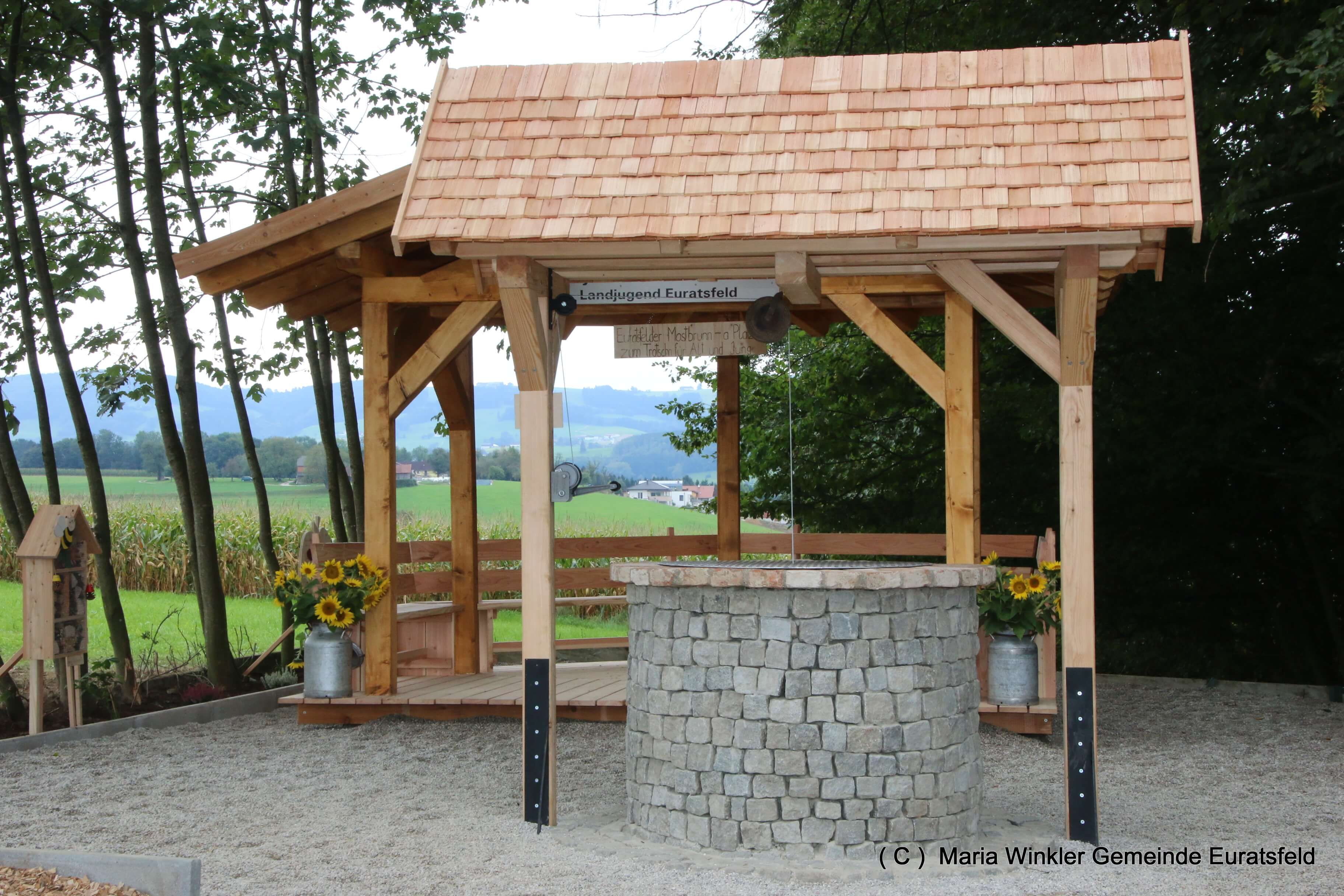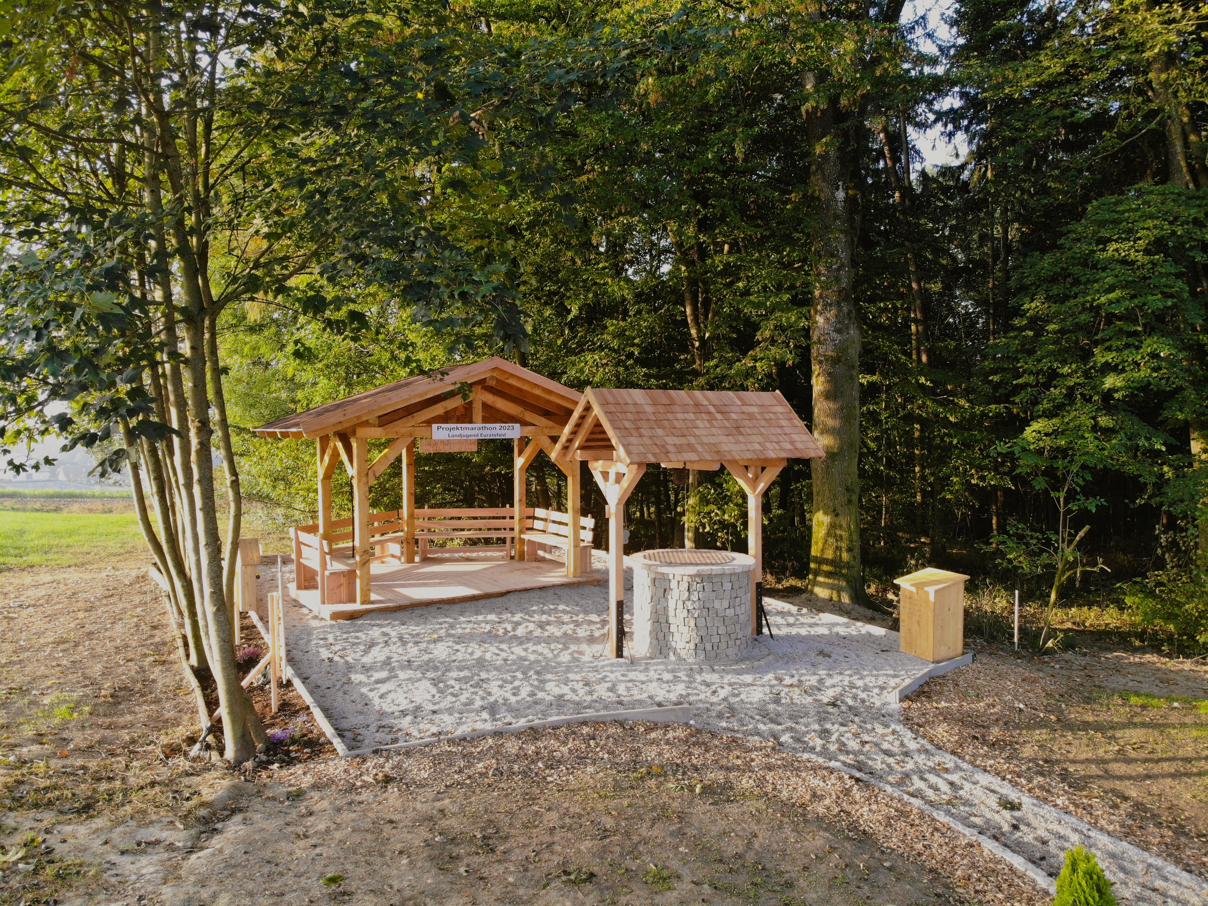 The fountain itself is lovingly decorated with woodwork and metalwork. A drinks basket provides cool drinks, while a sheltering pavilion with comfortable seating invites you to linger. There are planted areas around the fountain, an insect hotel to promote biodiversity, play areas for children and creative details such as a guest book with the title: "Hod da dea Cider gschmeckt fein, trog di in unser Biachal ein".
