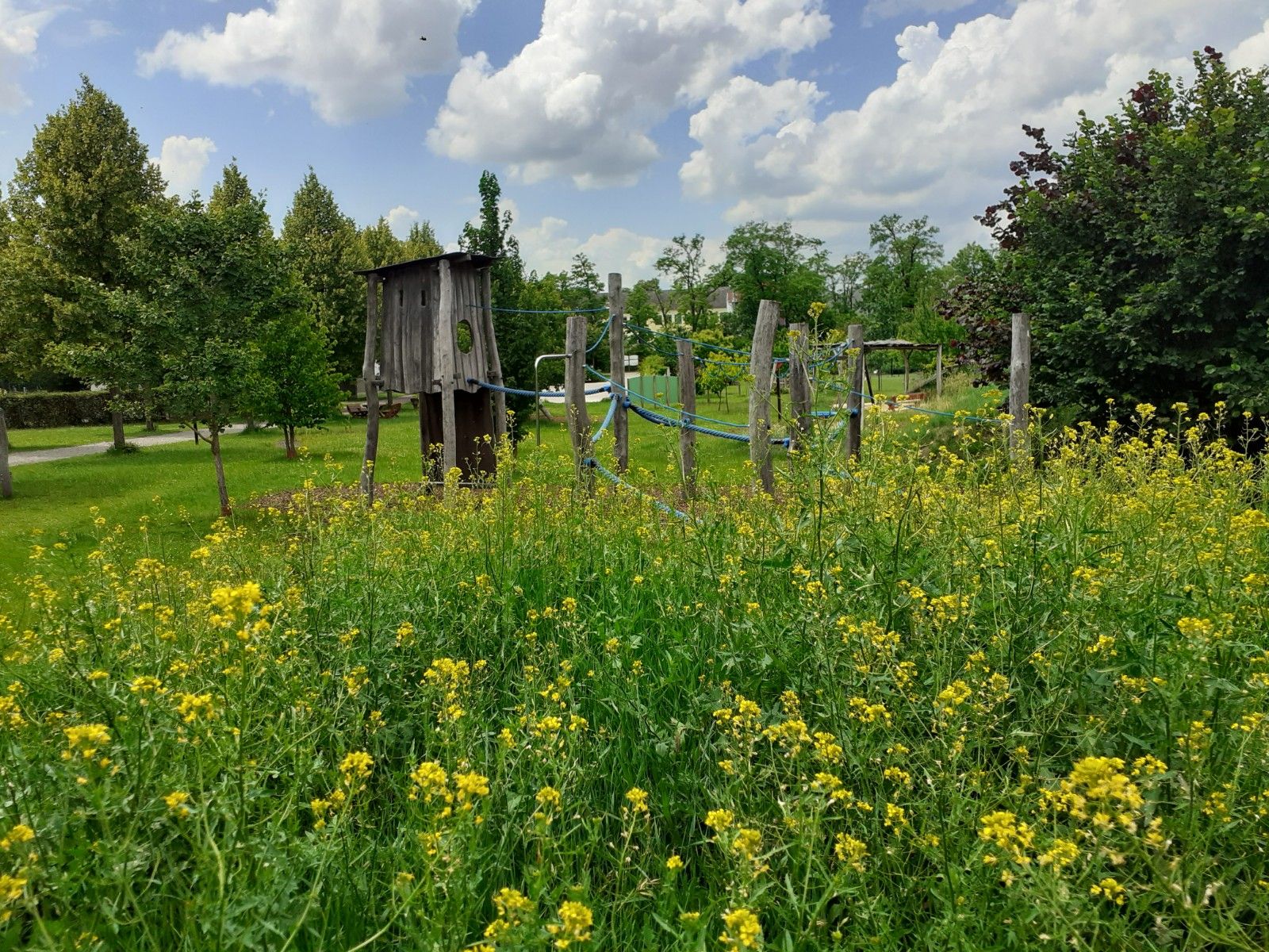 Spacious playground for small to older children. Flying Fox, slide, water play, swings, rope railing a hill and a large open green space. The playground leaves nothing to be desired. In the middle of a tree alley, benches and tables are available for a short break and snack.