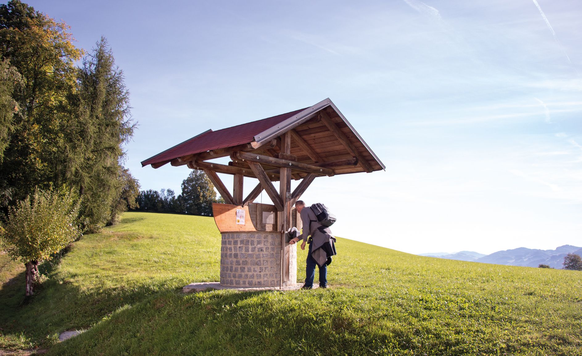 The Römerbrunnen between Kilb and Luft is a popular resting place for hikers as it is located directly on the Roman trail. Hikers can draw naturally chilled Roman beer, farmhouse cider, juices, schnapps and mineral water from a well shaft.