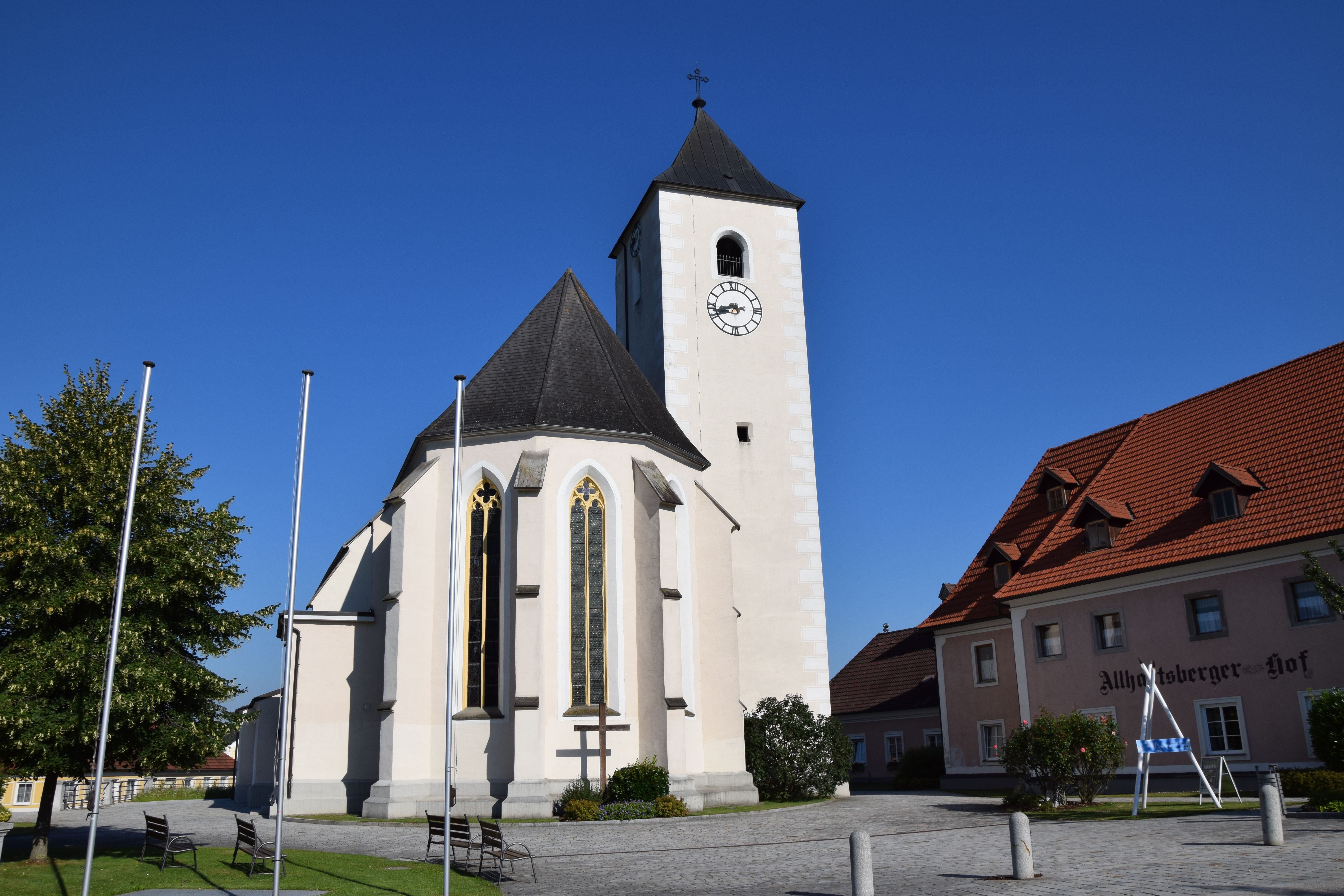 The municipality of Allhartsberg with its 2,000 inhabitants is located in the district of Amstetten on the Moststraße on the right bank of the Ybbs. It extends over 21.4 km² at the foot of the Sonntagberg, the center with the parish church is located at an altitude of 394 m above sea level. The landscape around Allhartsberg is particularly beautiful in spring, when the pear trees are in bloom. Due to its proximity to Waidhofen an der Ybbs and Amstetten, the municipality is a great starting point for excursions.