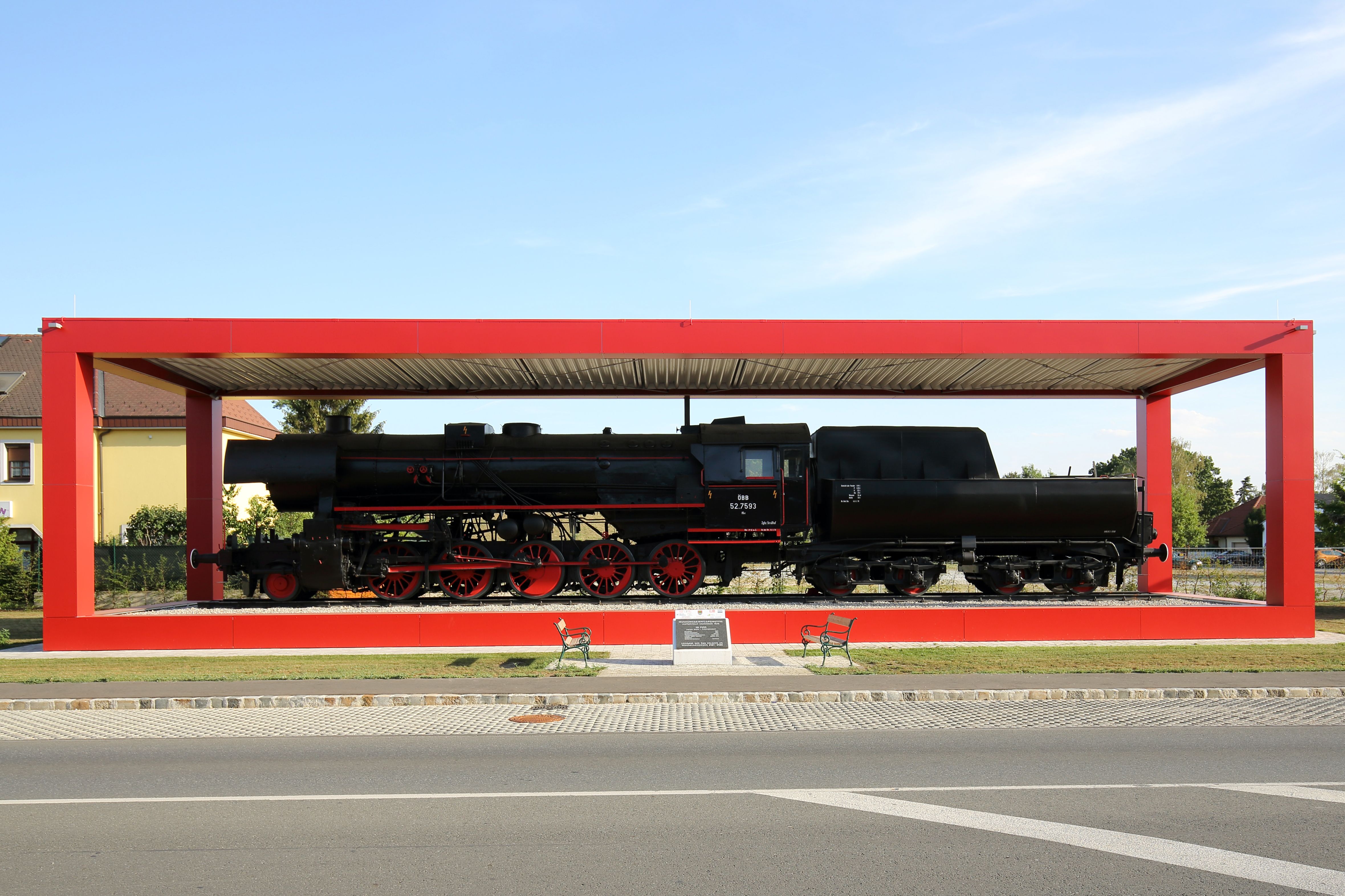 The monument locomotive was erected in November 1978 and renovated and extended with a roof from October 2021 to March 2022. In the past, models of this locomotive (small train) were sold in small packages and so the architect was inspired by such a package for this roof.
