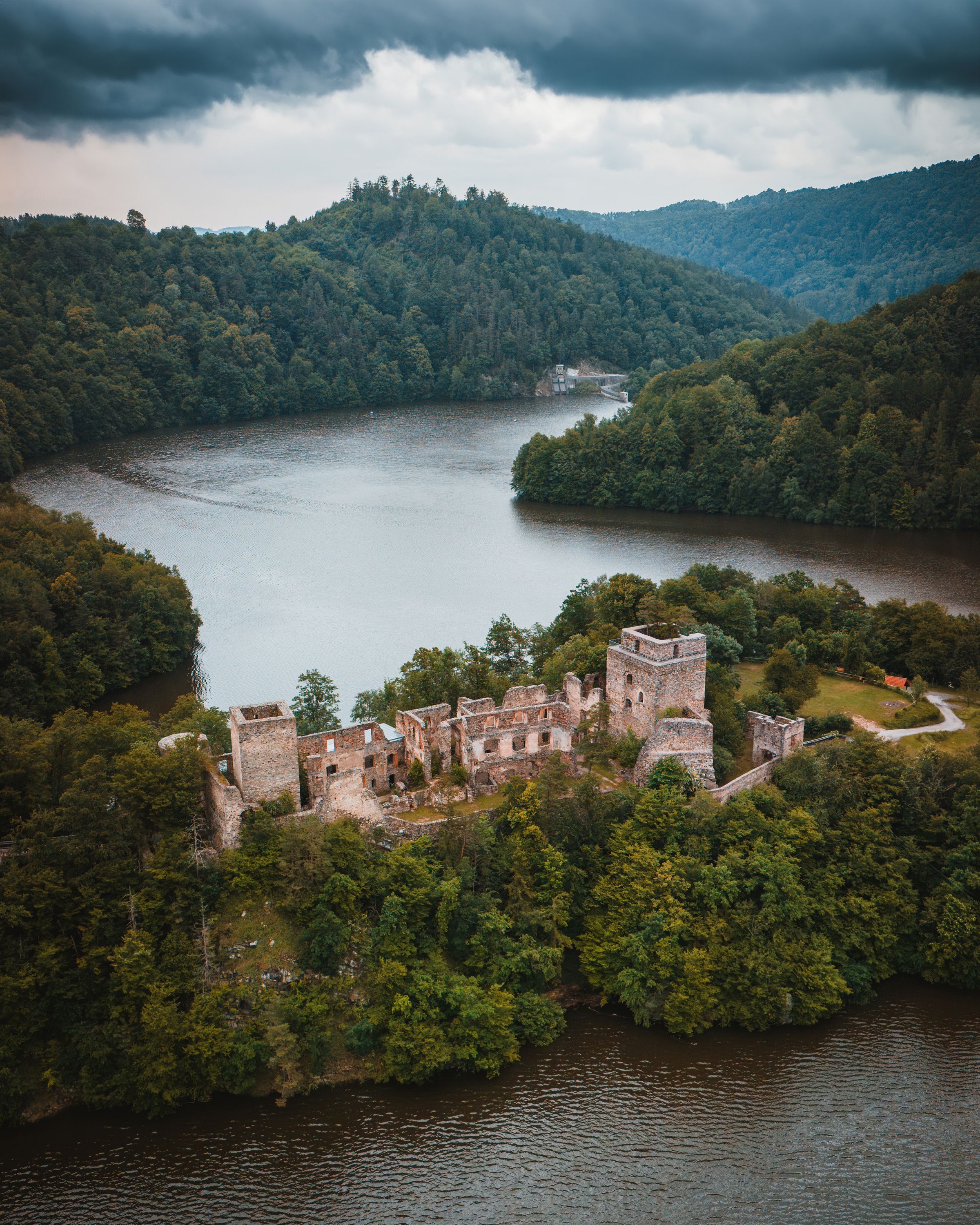 A cottage by the lake. This dream can easily be fulfilled. At least for a while. Since 2020, you can book three wooden houses with around 50 square meters directly on the Dobra reservoir. Fully equipped with a kitchen, veranda and everything else you need. Ideal for a maximum of six people. For doing nothing or being active. For boating, swimming, hiking, cycling or fishing. The Dobra ruins are also worth a visit.