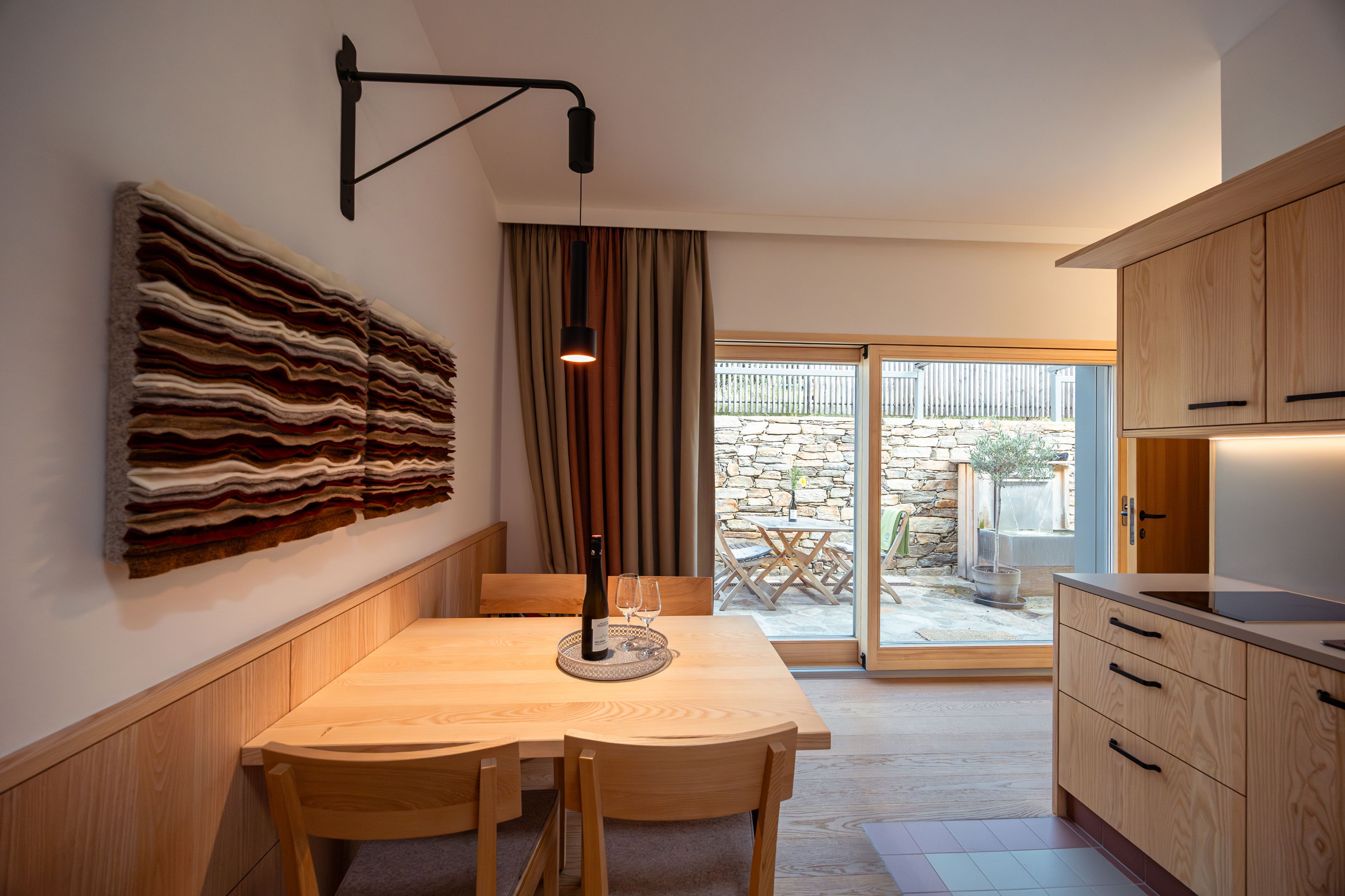 In the smallest wine town in Austria, in Schrattenthal, in the middle of the Stadtgrabenkellergasse, you will find the Weinviertler Kellerstöckl: Öhlberg, Hüttenberg and Kalvarienberg. All with natural wooden floors, tastefully furnished with natural materials, including their own terrace. And best of all: the fridge is filled with a colorful selection of fine Hindler wines. Plus a hostess who anticipates her guests' every wish. You'll want to stay longer here, or at least come back again.