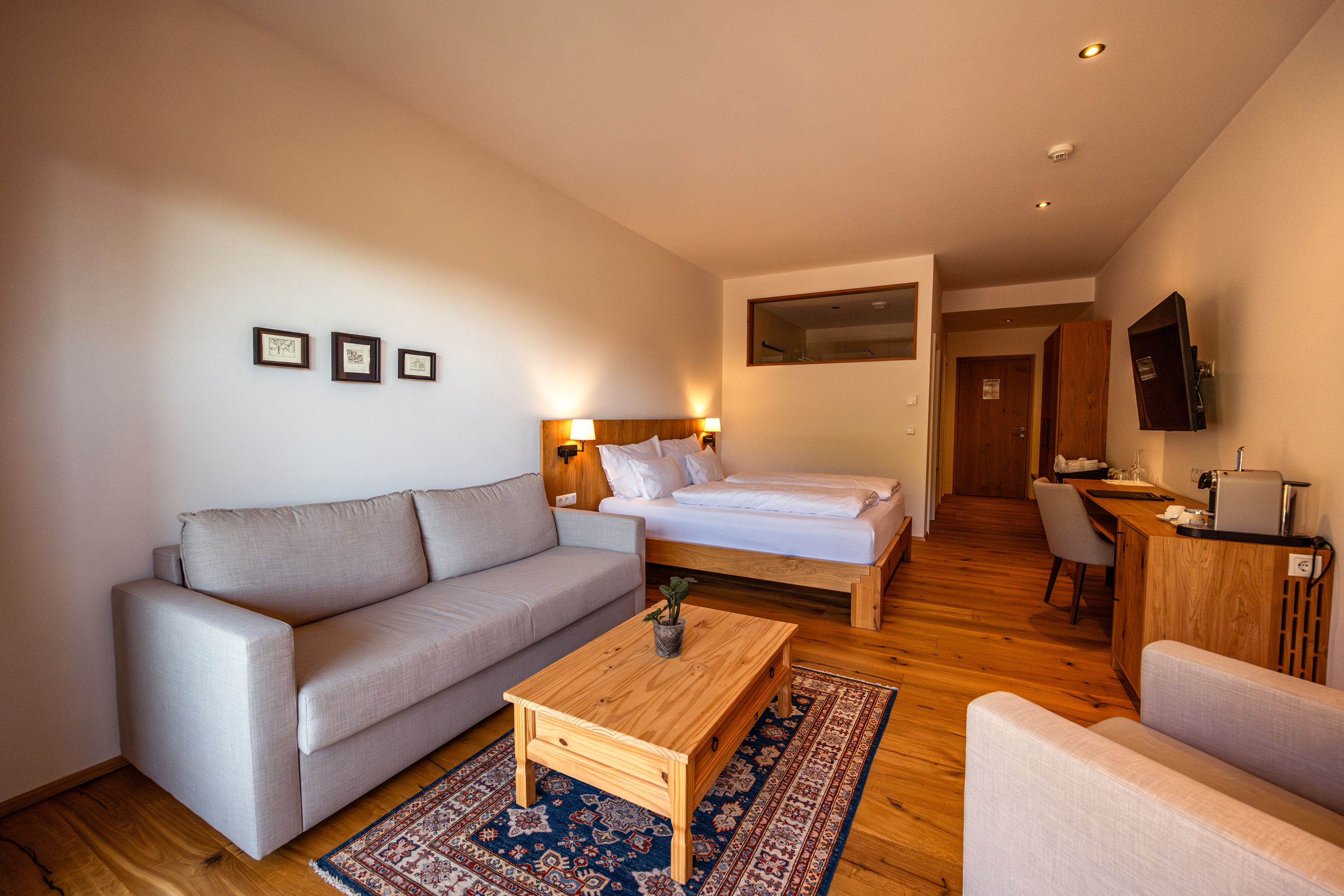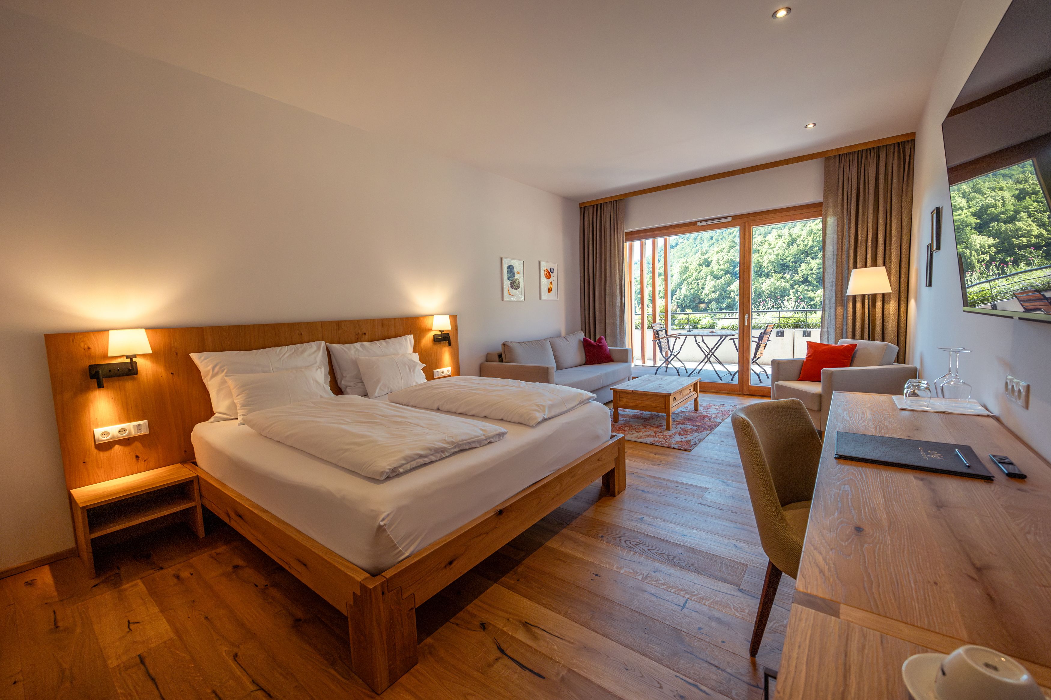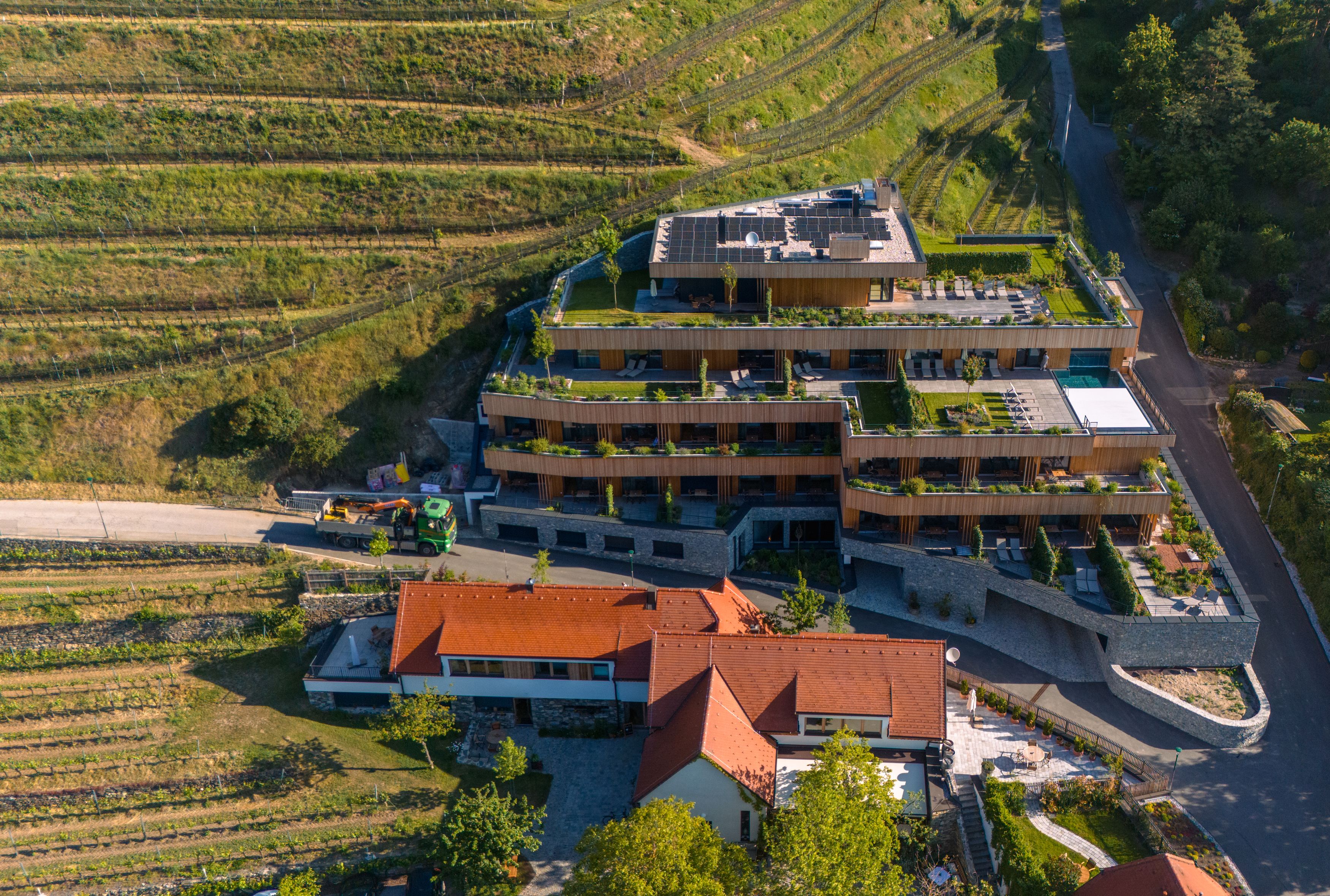 Built at the foot of the Senftenberg castle ruins, the hotel blends harmoniously into the terraced vineyards of the Krems Valley ("Kremstal" in German). The spacious spa area is spread over three terraces - with various saunas and relaxation rooms as well as an infinity pool, the location of which could hardly be more beautiful. An underground passageway leads directly to the main building, the Nigl family's winery. Known for the unmistakable taste of its wines, mainly Grüne Veltliner and Riesling. These and other varieties can be extensively tasted there. Fortunately, the way back to the beautiful hotel is not far.