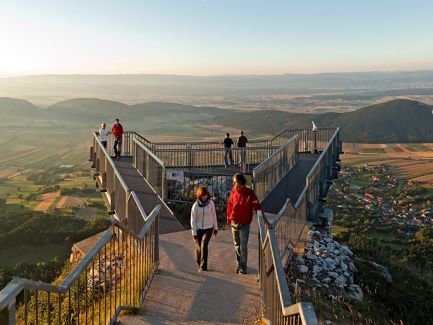 At the petting zoo, goats, donkeys & Co. await plenty of petting. Right next door, you learn interesting facts about the old trades of the Hohe Wand residents - lime burning in the lime kiln and the production of charcoal in traditional beehive-shaped charcoal piles. At the deer enclosure, you can be amazed: the otherwise shy forest animals come very close for food from the dispenser and even let themselves be petted. After admiring these noble animals, it goes on to Gasthof Postl. On the way there, you discover orchids and other rare plants at the side of the path. Airy deep and distant views can be experienced when you visit the Skywalk viewing terrace. Climbers ascend the Hohe Wand via various routes and compete with the ibex. Who can do it better? In any case, it is quite possible to encounter such a magnificent specimen on the rock faces. In good weather, you can also witness the start of the paragliders. Who would like to try a tandem flight or fly the glider themselves? The Fly-Hohe Wand flight school at Gasthof Postl makes this possible. For all those who want to refresh themselves before the return: At Gasthaus Luf, the fried chicken and of course all other dishes are highly recommended.