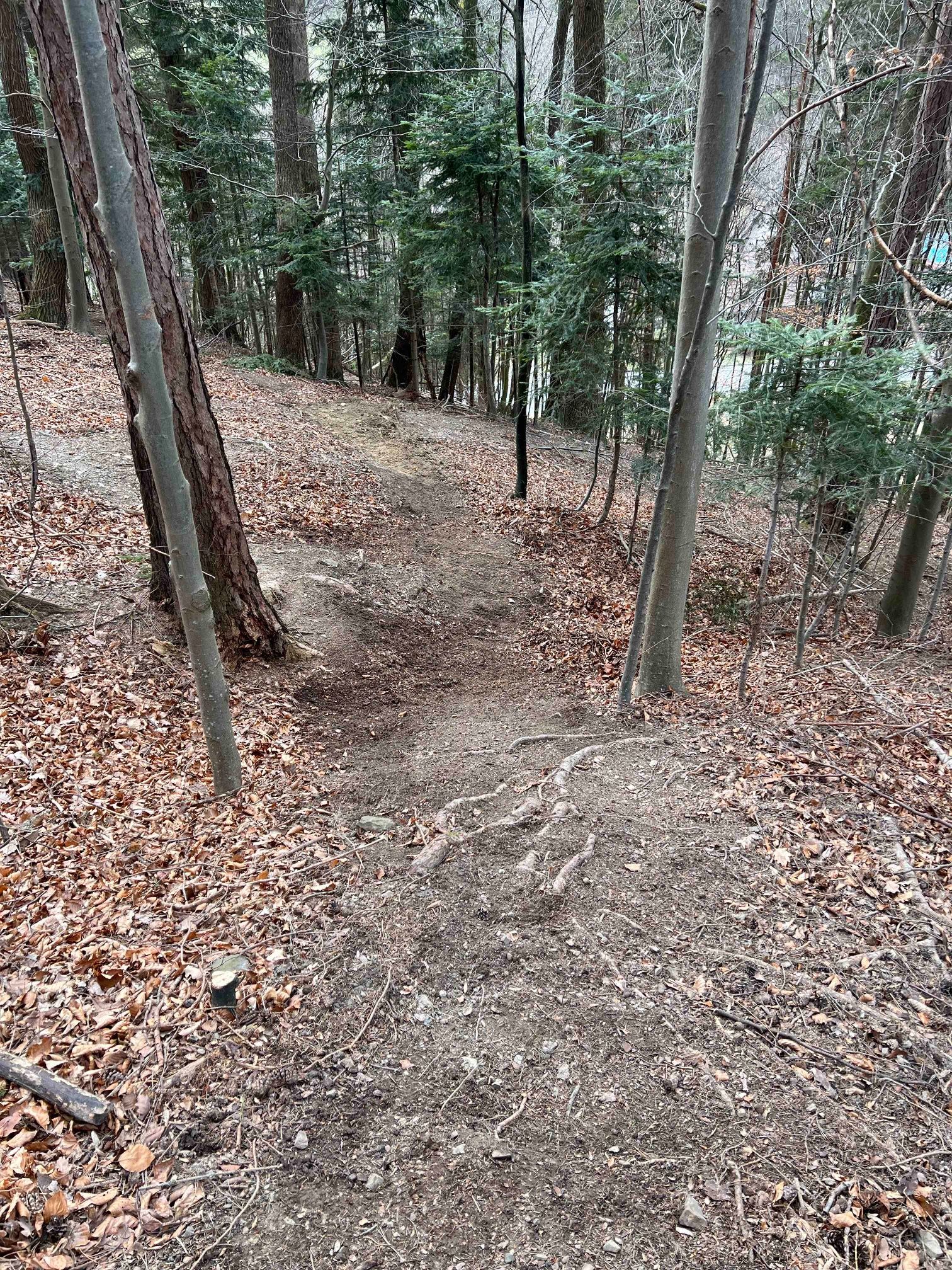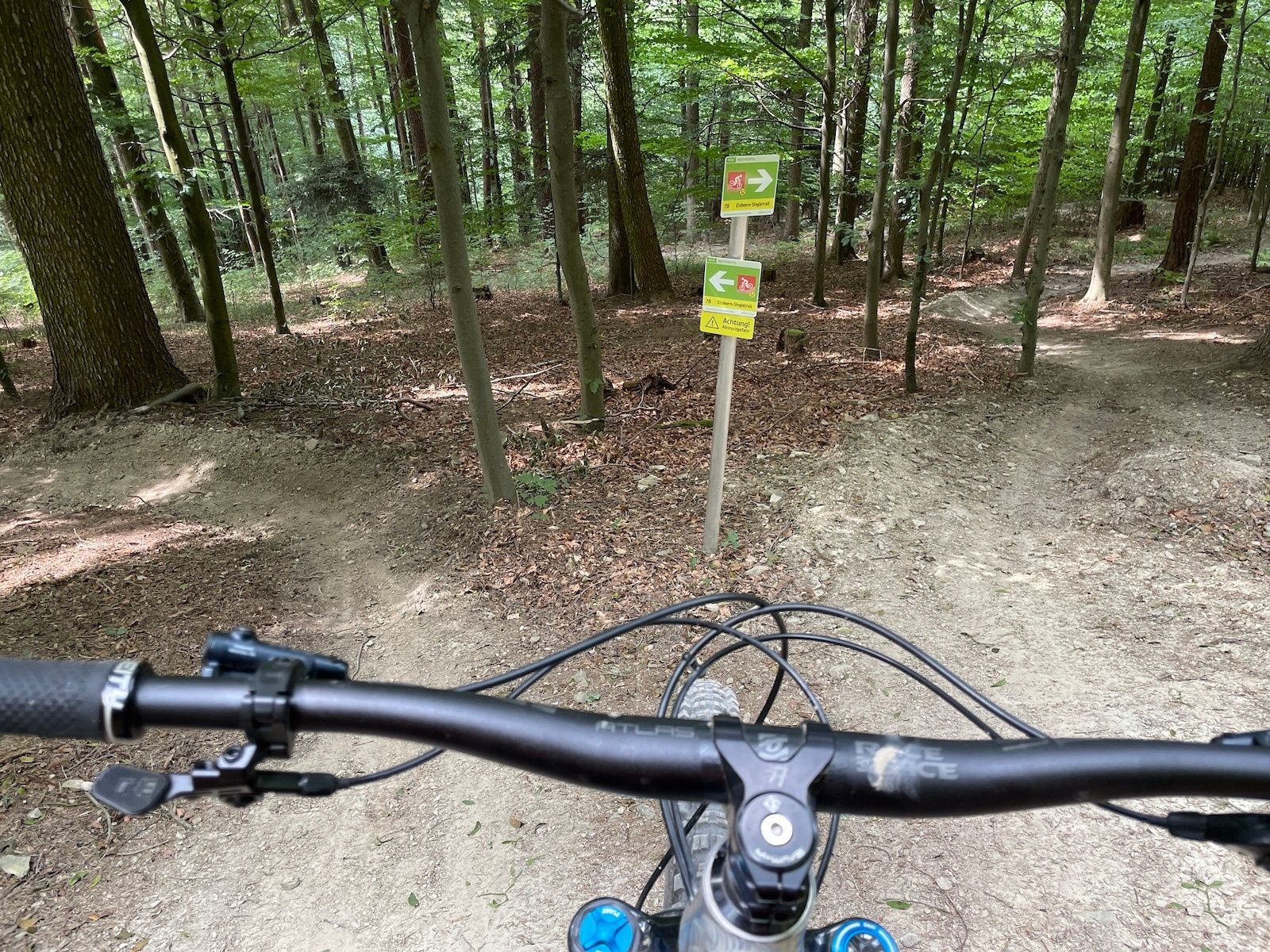 The single trail runs through a mixed forest and leads over forest soil with a stony character in places and varying gradients. In the lower section, the trail splits into 2 variants. Overall, the trail is easy to ride for advanced bikers.