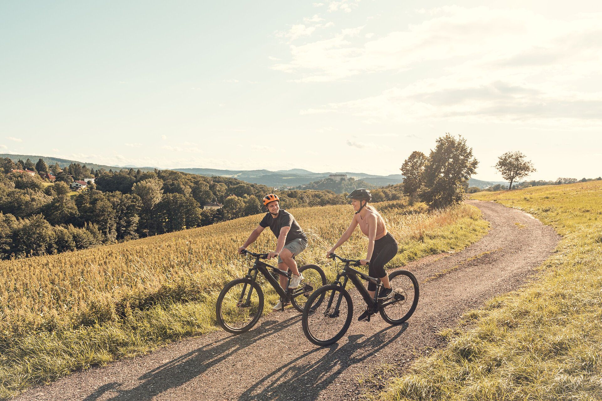 The Hafnerberg route combines scenic beauty with cultural sights and varied sections. A particular highlight is the baroque Hafnerberg pilgrimage church, which is an important pilgrimage destination. There are impressive panoramic views along the route, especially at Schwarzensee, where a wide view opens up over the hills of the Vienna Woods. The route leads along natural field and forest paths, which offer a particularly pristine riding experience between Gadenweith and Haselbach. It then leads through the leisure and recreation area in the Fahrafeld retention basin, the ideal place for a break including a pump track. In the Tasshof area, the route runs through a well-known riding area where, with a bit of luck, riders and horses can be observed in the great outdoors. However, particular caution is required on this section, as this section of the trail is shared with riders. It is recommended that you ride at half speed and stop to let riders pass if necessary. This tour combines a sporting challenge with scenic diversity and cultural insights and is ideal for mountain bikers who want to experience the Vienna Woods in all its facets.