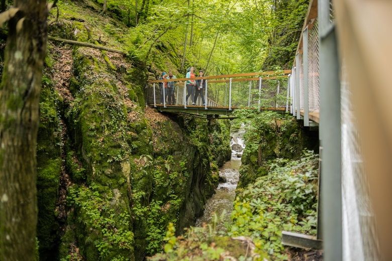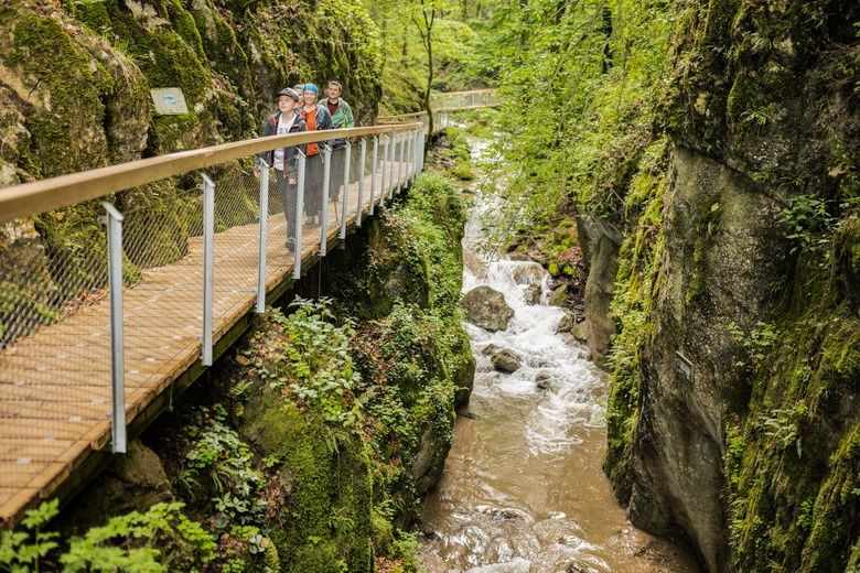 Circular hike from the WellnessWelt through the idyllic Johannesbachklamm gorge with refreshments available at the gorge inn. The trail leads over footbridges, stairs and bridges to the Gerhartl refuge, then continues over the Eichberg with magnificent views of the village. Two variants (1a/1b) take you back to the WellnessWelt. Also possible from Willendorf or Rothengrub train stations.