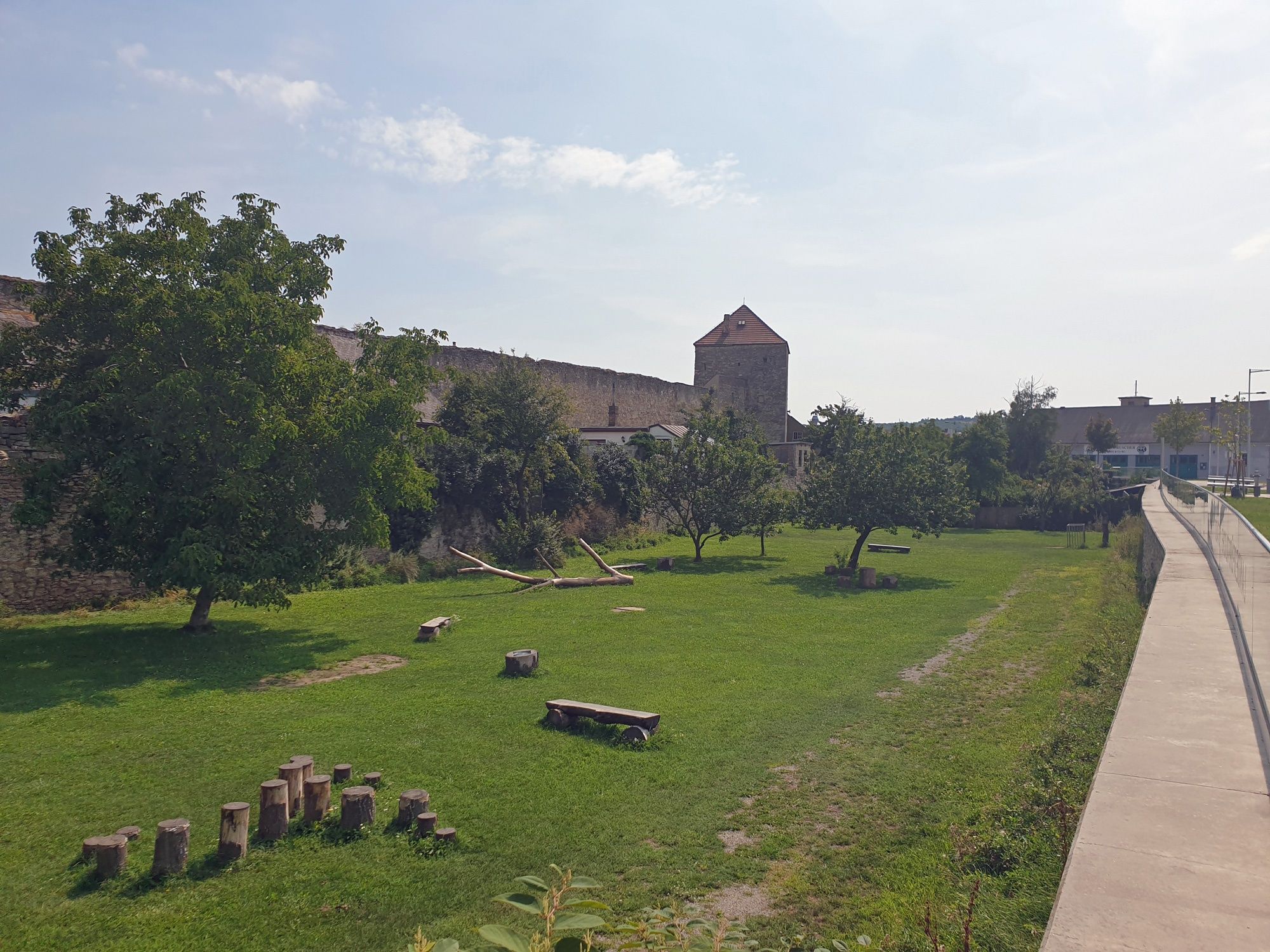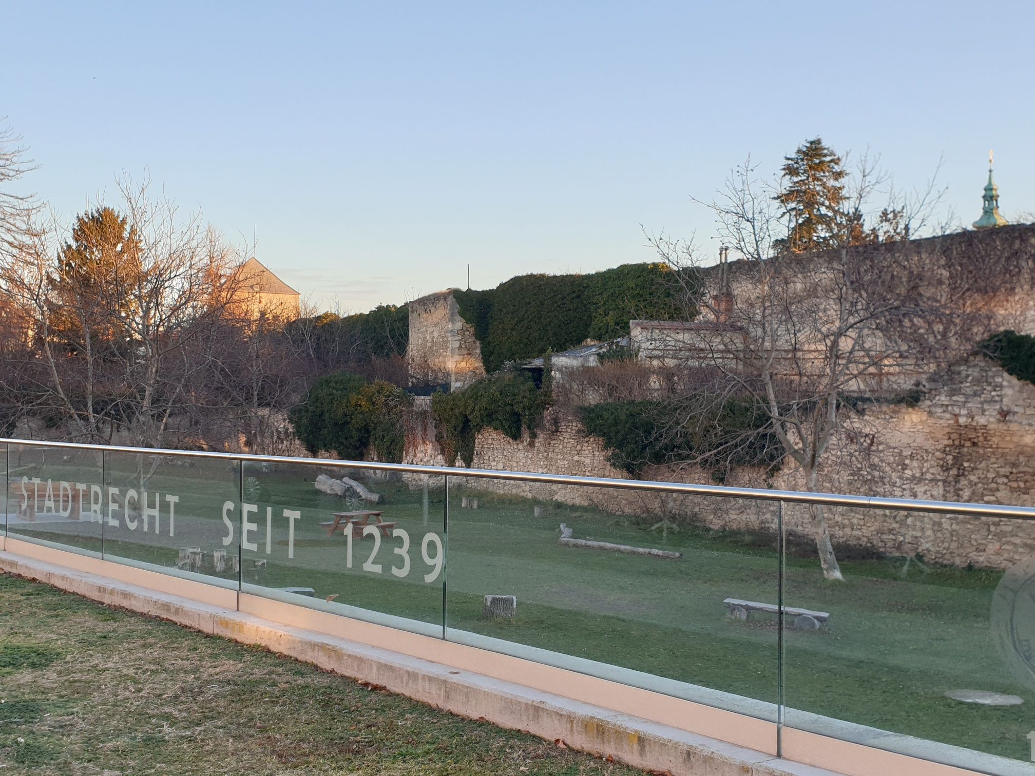 - Route description You start at the Main Square Bruck an der Leitha, at the display case in front of the Naglreiter bakery. Here awaits the first audio story "The Secret of the Cross Orb". Now you cross the street and turn into Kirchengasse (pedestrian zone). Walk straight ahead until you almost reach the end, where you can read information about the former church gate on a glass information board. The board is located at the level of Schmalgasse on the left side. Upon arrival, the second audio story "The Busy Kirchengasse" follows. Then walk to the end of Kirchengasse, where the guild tree mentioned in the audio story can be seen. Now keep right and follow the directional arrow, pointing right towards Raiffeisengürtel. Follow this until you reach the beautiful city moat and, passing the roundabout, continue along the city walls until you reach a rest area with display panels. There you can take a short break and learn many exciting details with the third audio story "The Contested Border Town Bruck". Continue straight ahead, cross Wienergasse, and proceed until you reach Schulgasse, where you turn right. At the beginning of Schulgasse on the left side is the striking Pechnase. The audio story "A Clever War Ruse" tells more about this building and the turbulent times. At the next fork, turn left into Raabergasse. At the bend of the street to the right, the fifth audio story "How Raabergasse Got Its Name" awaits. Continue towards the castle. You cross Hainburger Straße and go straight into Johngasse – and the "castle" is already visible on the left side. The audio story "Imperial Jubilee Celebration in the Castle" reveals more about this building. Follow Johngasse and turn left into Stefanigasse. After a short distance, you arrive at Schloss Prugg. Here waits the last audio station "Schloss Prugg and the Harrach Family." Continue through Schlossgasse, turning right at the end into Burgenlandstraße. This street leads back to the Main Square, the starting point of the local walk Bruck an der Leitha.