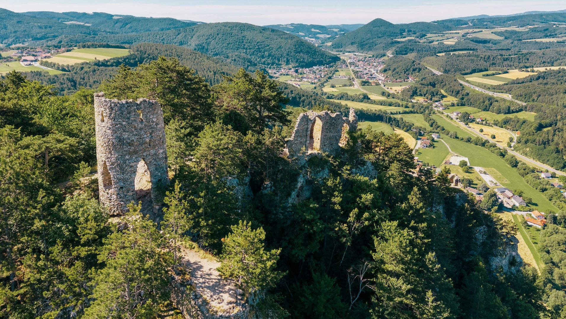 An inspiring hike over the Seebensteiner Schlossberg to the artificial ruins of Türkensturz - easily accessible by public transport! Visiting the Türkensturz ruins is only possible at your own risk.