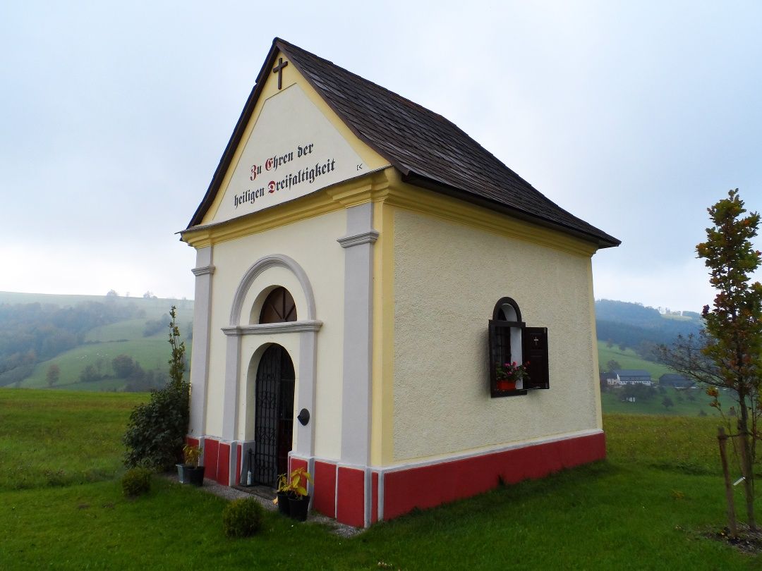 Starting from the pilgrimage basilica on the Sonntagberg, we begin today's stage eastwards through a pleasant wooded area to the Türkenbrunnen fountain. The Türkenbrunnen fountain commemorates the so-called "Horse Miracle" in 1529, when Turkish horsemen attempted to plunder the church on Sonntagberg. According to legend, the horses fell to their knees at the fountain - frightened by the holy place - and refused to move on. The Turks were thus forced to turn back. In 1677, a chapel was built next to the spring to commemorate this event. After the fountain, we hike over the Herzogenberg and then along the Panorama-Höhestraße to St. Leonhard am Wald, where we enjoy a break after a rather strenuous climb. Right at the entrance to the village there is a beautiful chapel dedicated to St. Hubertus, from where we have a wonderful view of the valley. A few meters later, in the village center, we come across another chapel and the "Fiakerkirche" of St. Leonhard. The Viennese hackney carriage drivers have been making a pilgrimage to this church every year since 1826, as St. Leonhard is the patron saint of horses, cattle and sheep, among other things. From St. Leonhard, the route descends for a long time, passing beautiful farms and walking through avenues of fruit trees on long bends down into the valley. In Schwarzbach we come to the Urlbach stream and can take a break here at an idyllic chapel on the banks of the stream before climbing back up towards Ybbsitz. On the way to Knieberg, we make a pilgrimage through lush meadows, past comfortably grazing cows to the last hill before our destination for today. From here, we have a fantastic panoramic view of the Prochenberg (1123m) and the Maisberg (942m), as well as the village of Ybbsitz in the valley, which is also the end point of our stage.