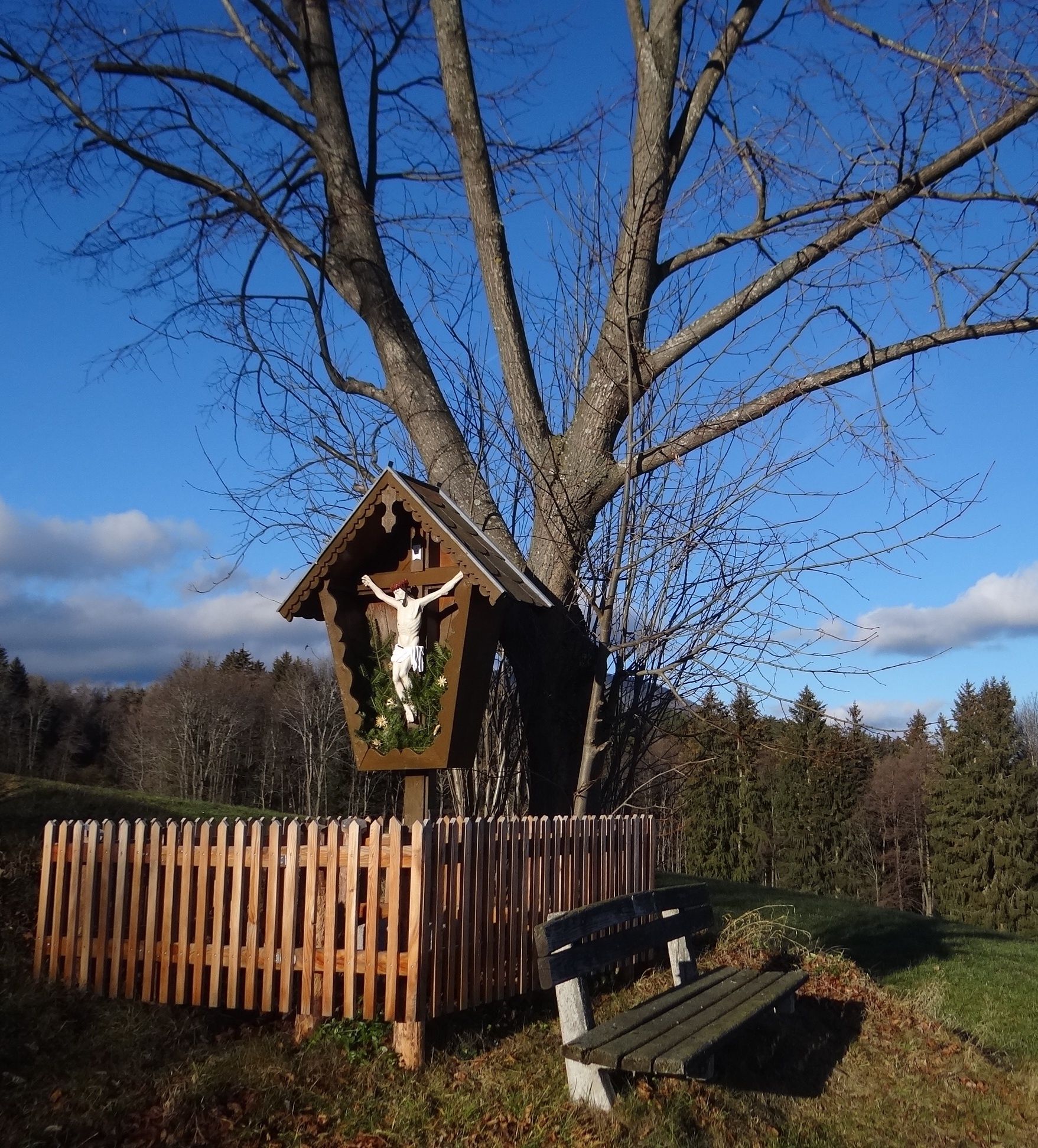 We follow this road until the next sharp bend to the right, after which the yellow signpost points us to the left, where we walk relatively steeply uphill along the edge of the field. Finally, we reach a wayside shrine with a bench, where we can take our first well-earned rest and enjoy the view of Kirchberg and its two churches. Now we follow the tarmac road for a while until we reach the "Kreuzbauern", after which we enter the forest on a forest path. We soon reach a fork in the path. The one on the left leads to the Steyersberger Schwaig, the one on the far right back down into the valley. We choose the middle path with yellow markings. We then hike along this forest path, which has already grown, for a relatively long time. Finally we come out of the forest and cross a natural dam, the so-called "Holzgasse", which is already in the Alpltal valley. Here, too, a bench invites you to take a break. Here you also have the otter in front of you and beautiful views of the Rax.