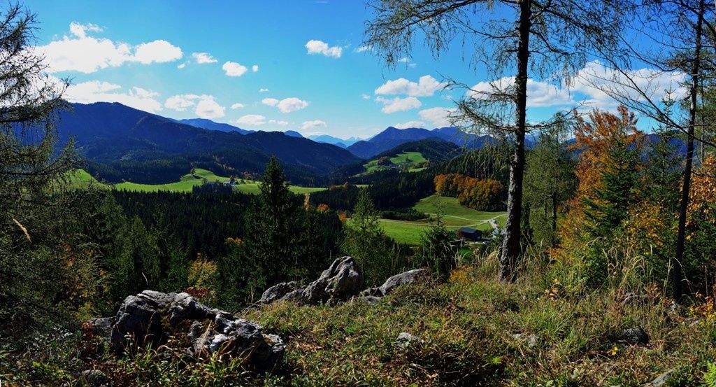 The start is at the Ablass farm, which is right between the house and the farm on a meadow path into the forest. The forest roads are already very overgrown and therefore pleasant to walk on. Then there is a section on a well-marked path and you reach the Steinkogl (910 m above sea level) with a view over the whole of Hochreit: Voralpe Gamsstein, Gesäuseberge, Hochkar...
