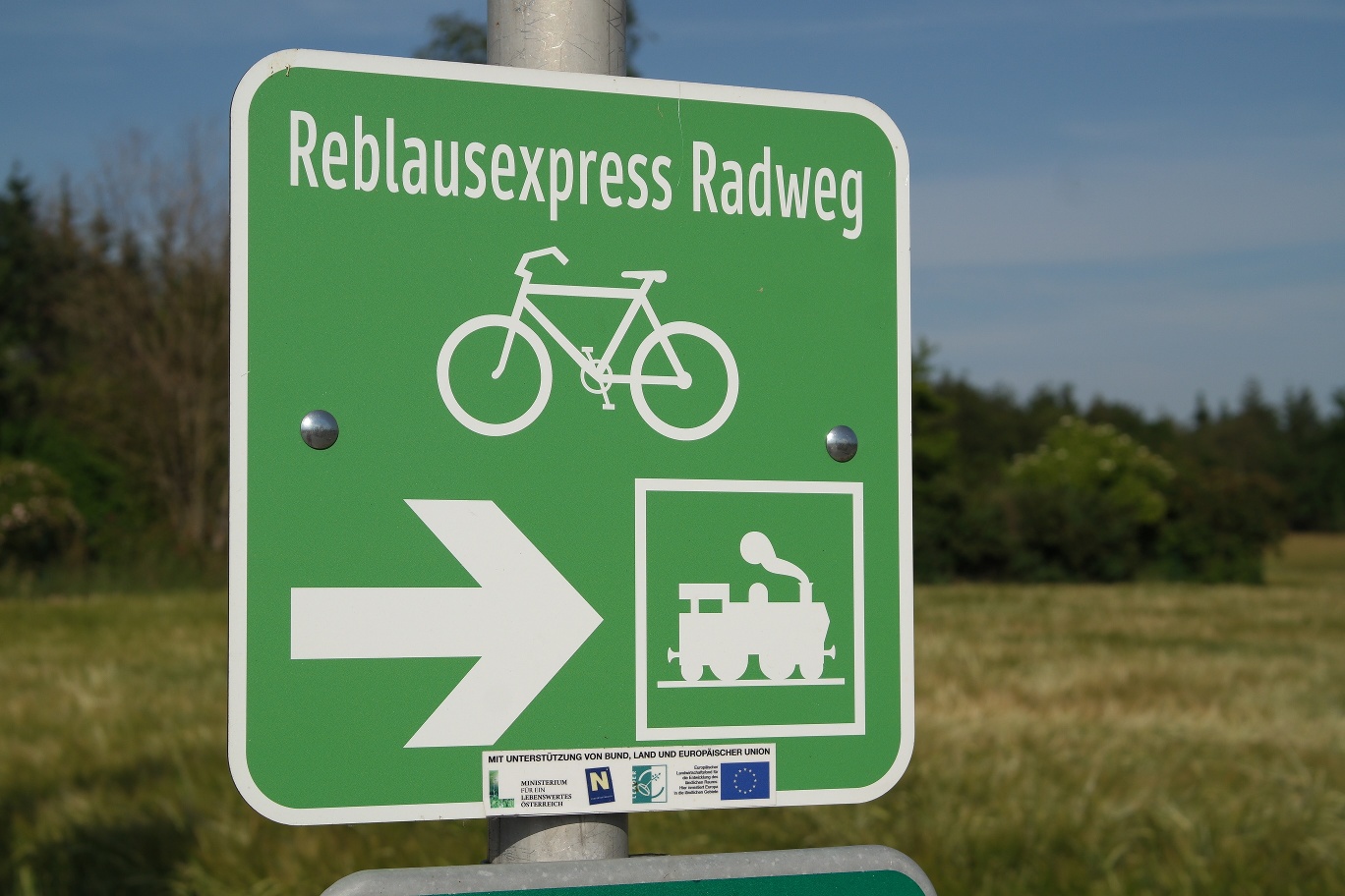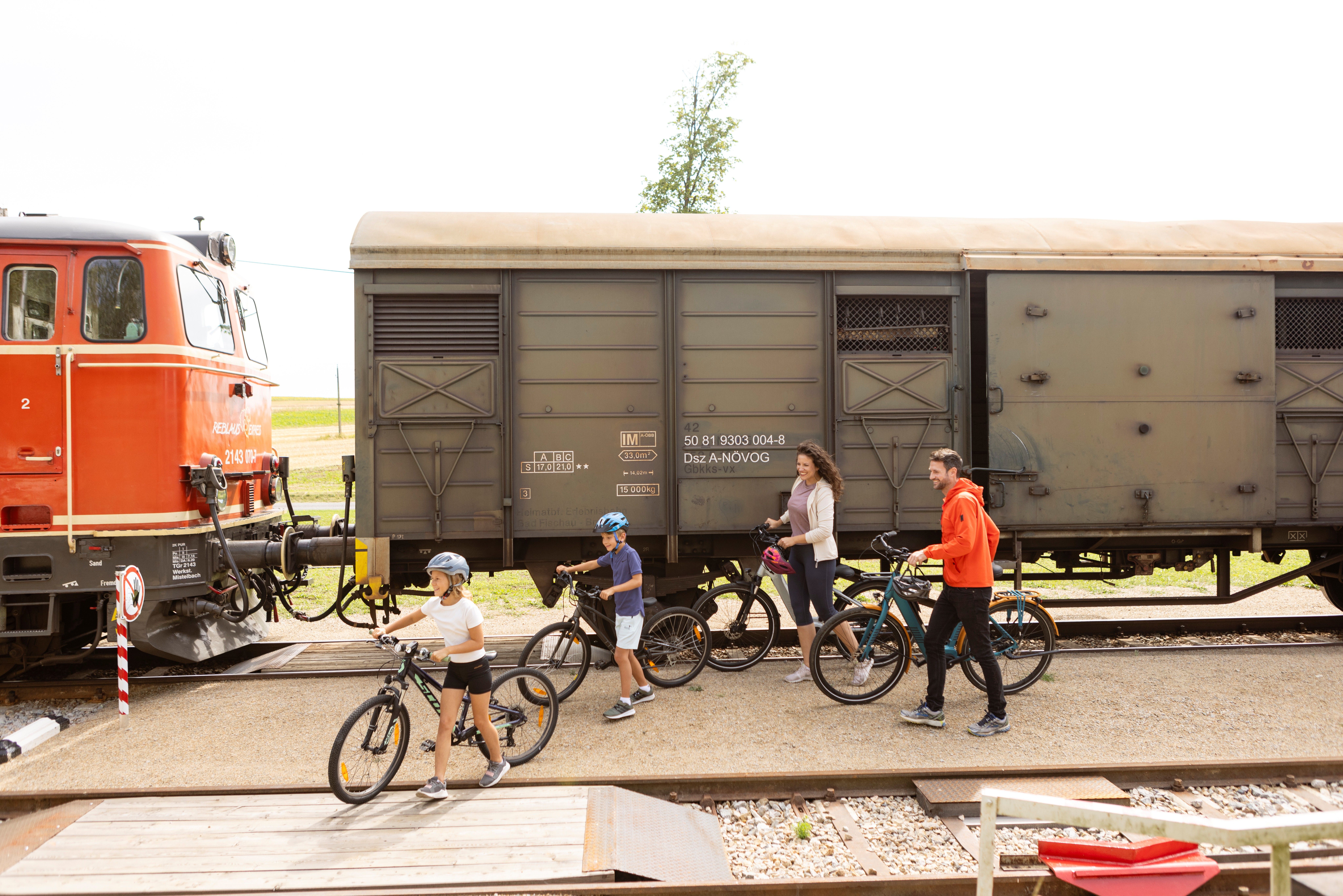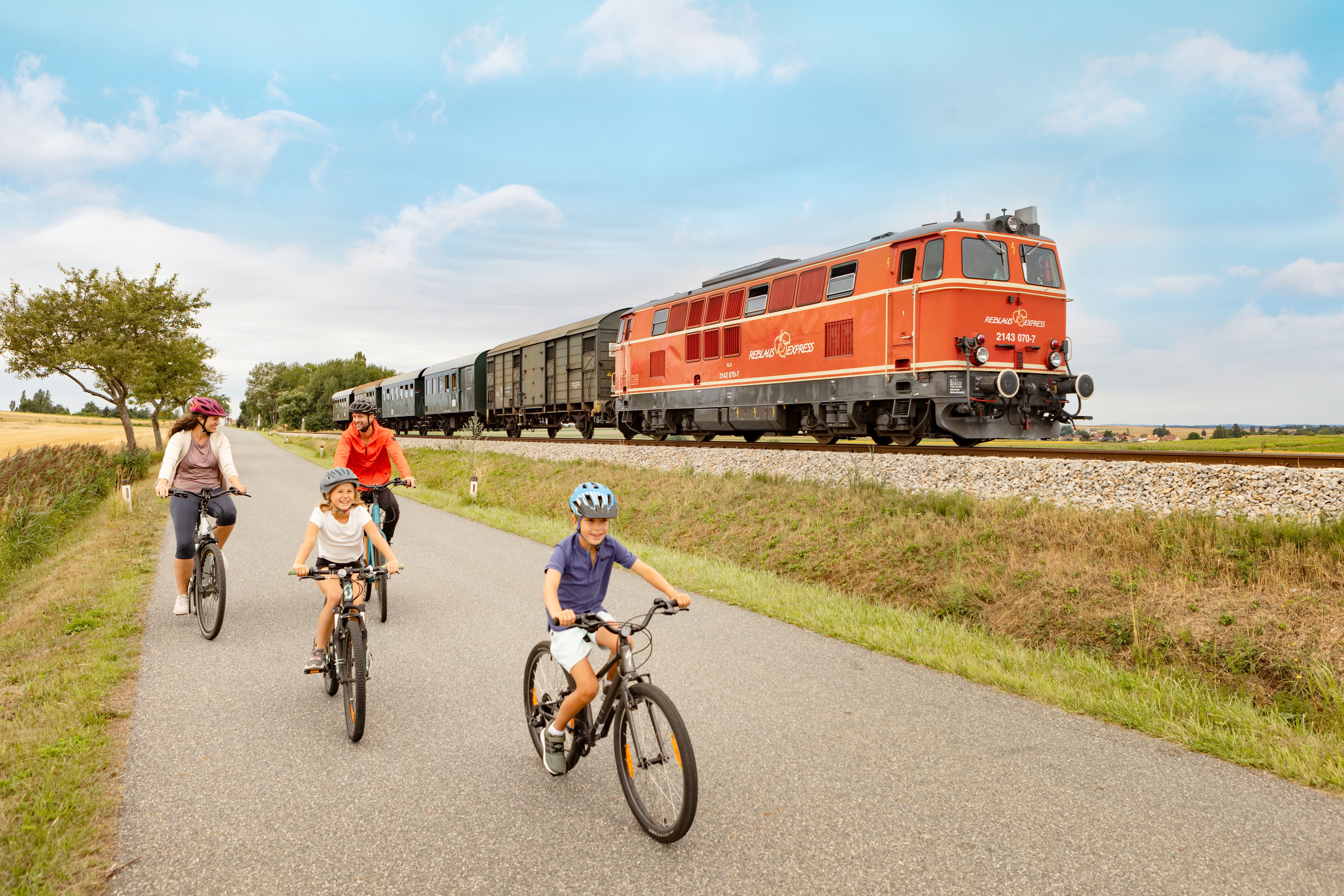 An idyllic bike route along the tracks of the nostalgic Reblaus Express: The path runs through small villages, lush vineyards, and wide fields into the wine town of Retz.