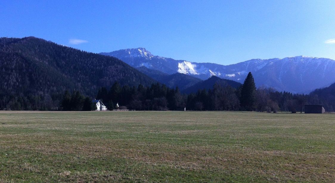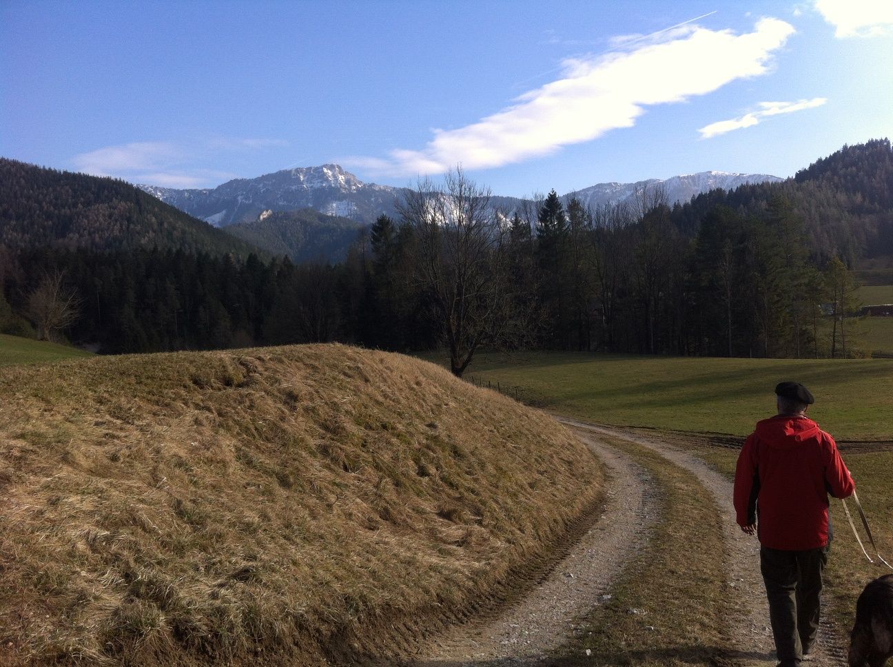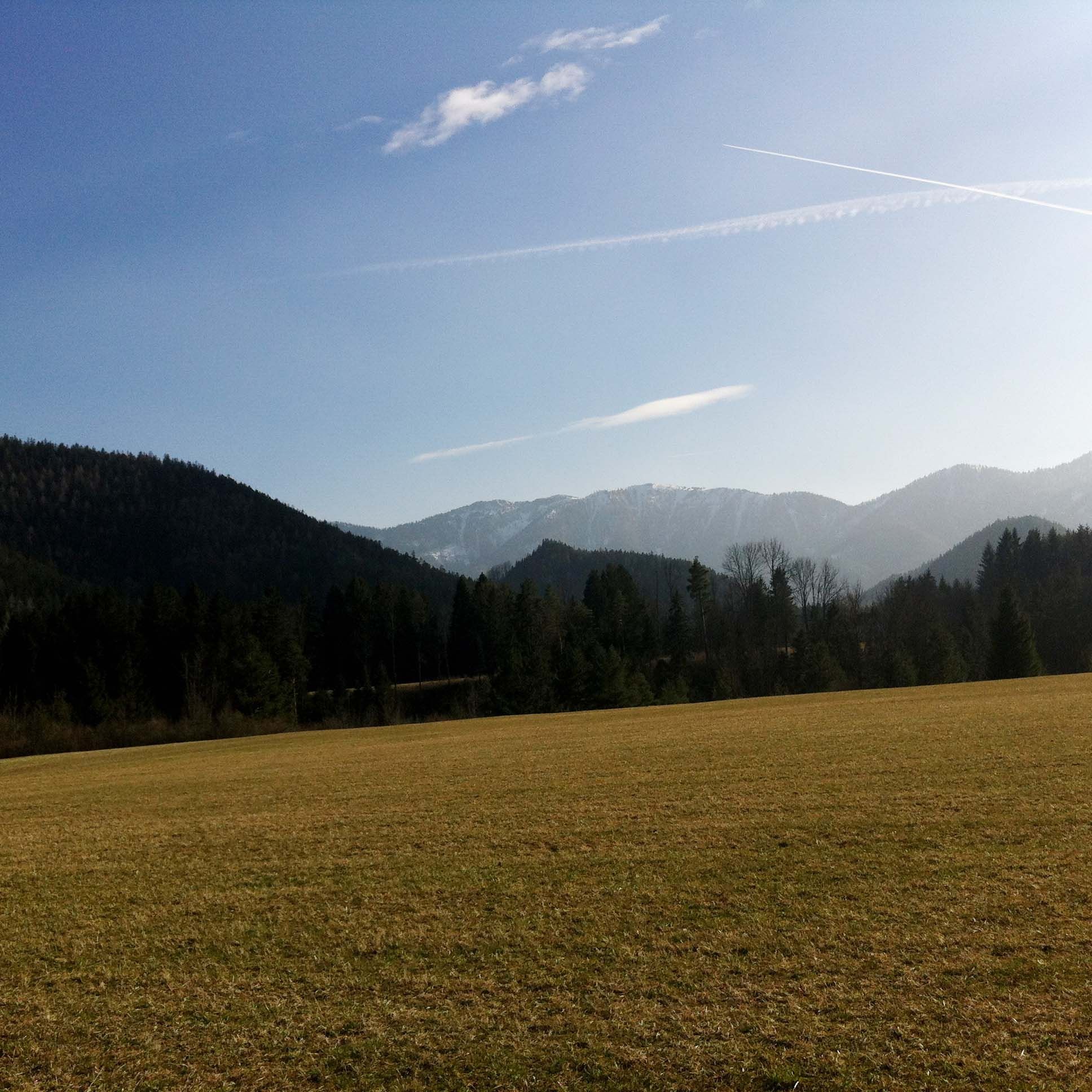 The Scheiklhöhe circular trail starts with the other trails 4, 5 and 7 in the market in front of the Raiffeisenbank and then continues along the Unrechttraisen next to the house with assisted living. The path then branches off to Grillenbühel. To the left, we see a very clear stream and then climb steadily uphill. On the right-hand side, we look down into the Unrechttraisen. We soon make it and are rewarded with a wonderful view of the Goller. A little to the left, we can also see the Hofalm and the Gippel. A little further on to the left, we can also see the Schneeberg.