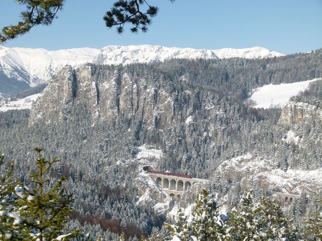 From the top of the pass via the high road past Hotel Panhans to the Holy Family Parish Church and rectory. Downhill to the station and east along the track under the underpass to Wolfsbergkogel halt. Steeply uphill for a short way to the former sanatorium and the Double-ridge lookout tower and the "20 Schilling view". The view down onto Semmering Railway through the Adlitzgraben and the highest spurs of the Eastern Alps, Rax and Schneeberg, is very imposing. The path then passes through the forest above the entrance to the Wolfsbergkogel tunnel and on to the Fleischmann viaduct in Adlitzgraben. To the left the path runs uphill to the golf course and the Südbahnhotel. Continue straight on here to the top of the pass.