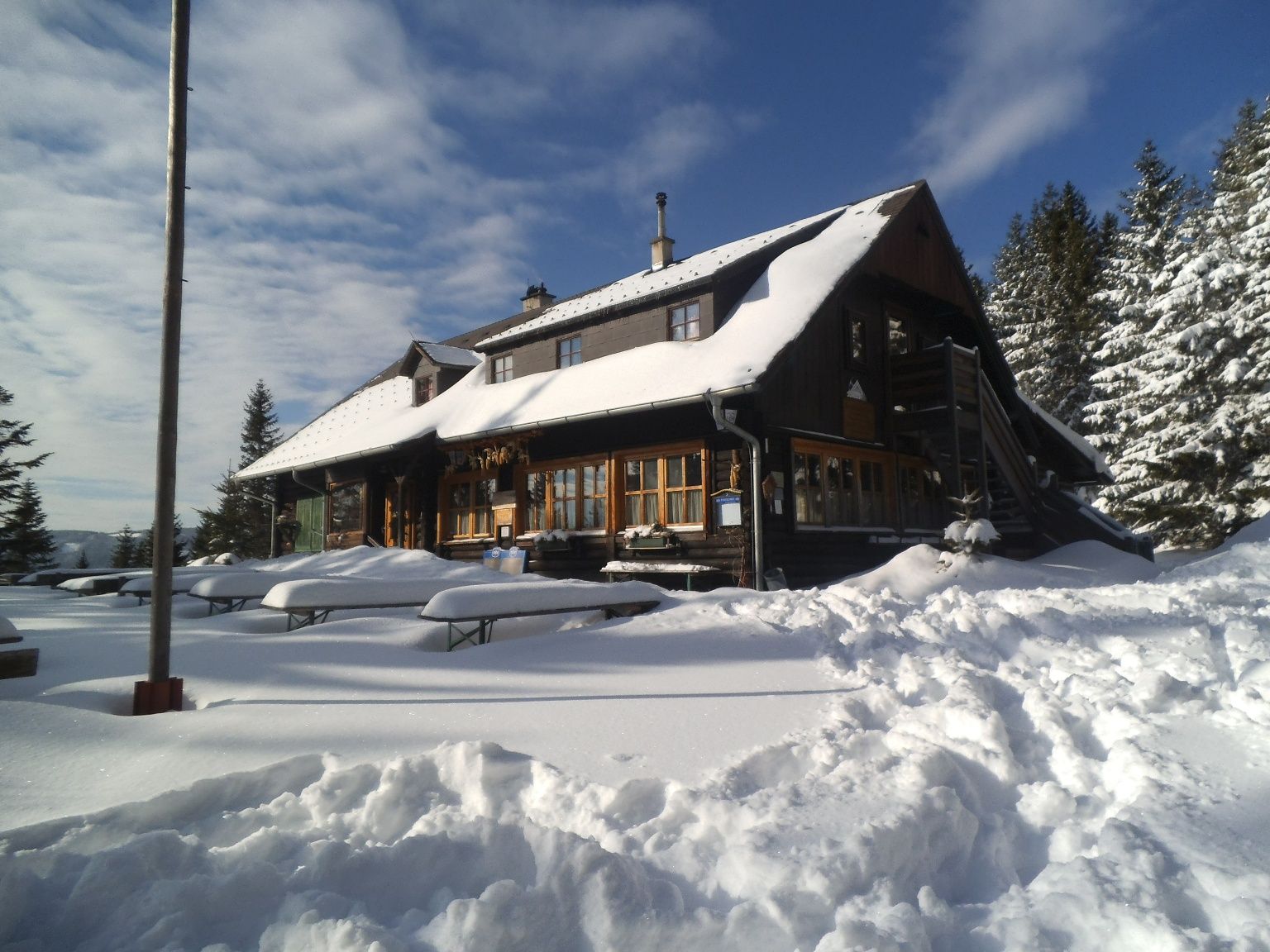 The snowshoe hike starts at the Simashütte near Unternberg/St. Corona, close to the valley station of the former Simas lifts. The Simashütte is open in summer and winter for multi-day wine taverns and is otherwise only available for private events. In winter, depending on snow and weather conditions, it is also open. Parallel to the lift system, you hike up in switchbacks towards Kampstein. Here you can trudge through the snow in the forest and enjoy the peace and fresh air. The goal or intermediate stop of the route is the Herrgottschnitzerhütte, named in honor of Franz Kaupe. At the hut, hungry guests are offered delicious homemade cream slices and warm delicacies. Dog lovers will also meet the hut owner’s huskies who appreciate strokes. Additionally, for the roughly one and a half hour ascent, you are rewarded with a wonderful view of the Wechsel area. From the Herrgottschnitzerhütte you have several options for further hiking. Experienced and well-conditioned hikers can climb the Kampstein summit at 1467 meters. Those with less time can hike back down the valley, either the same way as up, to the Simashütte or via Orthof to Unternberg. Alternate routes from the Herrgottschnitzer can be found in the "Kampsteinrunde".