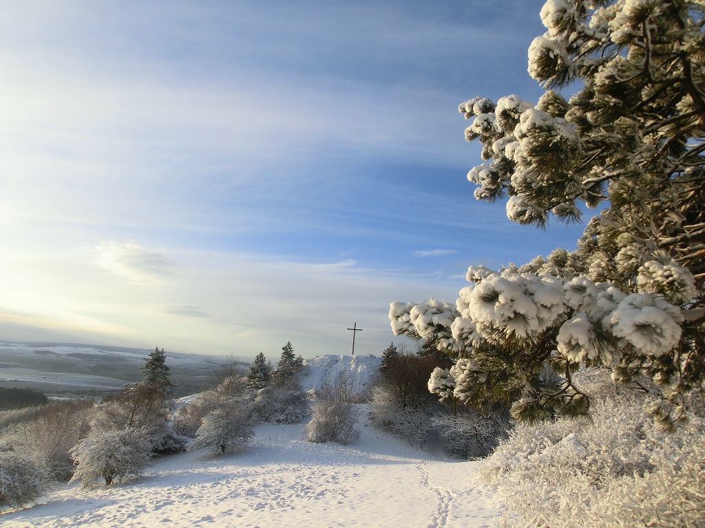 At the top, the path merges into the high trail, and now the prominent radar dome already points the way. Looking back, one sees the village of Oberleis, which, apart from the parsonage, consists only of a single house and the pilgrimage church, which seems to cling to the hill.