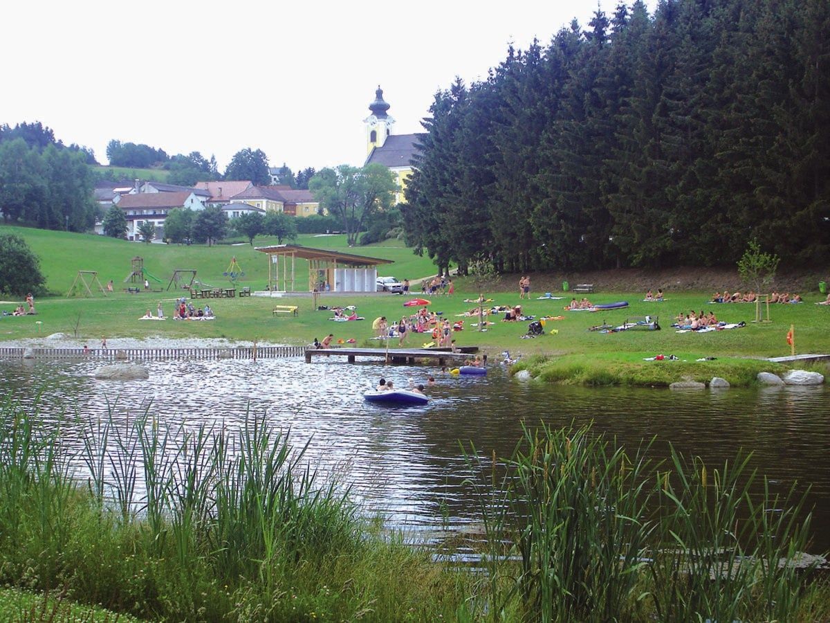Swimming pond with sunbathing lawn, exercise trail with various stations, ruins (="Stockzahn" of the Waldviertel) with a magnificent view, bee-themed trail with information boards.