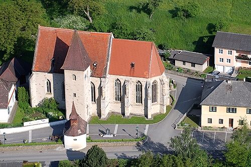 The small hamlet of Heiligenblut with its pilgrimage church of St. Andrew is the heart of the market town of Raxendorf. According to legend, the late Gothic hall church from the 15th century was founded after a miracle of the host in 1411. The baroque tower with its blue clocks, the free-standing original chapel, the fine cross and ribbed vaults and the strikingly steep roof are remarkable. In the late Gothic choir is the famous stone sacrament house, eight meters high and decorated with filigree tracery. The actual heart of the church, the Gothic altar - the Roggendorf Altar - is located in Belvedere Palace in Vienna.