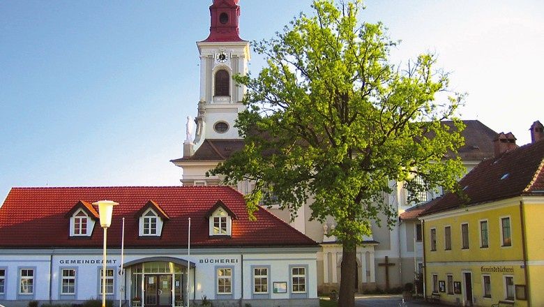 From Nondorf to Hoheneich: Starting from Gasthaus Ambrozy, walk across the Elexenbach in the direction of Gmünd until just before the bus stop at the entrance to the village. There you turn right onto a field path (Überländerweg) which leads to the Elexenbach. Approx. 100 m after the bridge you come to a crossroads and turn left towards Hoheneich next to the Elexenbach stream through a wooded area. You pass a ditch, then continue along the path to the Hubertus Chapel, where you walk through 2 small sections of forest before reaching the main road shortly before the railroad crossing (Kaiser-Franz-Josefs Bahn) next to an accident warning sign. From there, turn right onto a path that accompanies the main road over the railroad and uphill through the forest until you reach Hoheneich. The route now continues straight ahead past the Annamarterl (left) and a 17th century Way of the Cross station (Way of the Cross from Kirchberg am Walde to Hoheneich). You walk along the Bahnstraße to the market square, the center of which is the beautiful pilgrimage church. In front of it stands the "Hohe Eiche". Hoheneich" is said to have been named after this or its predecessors