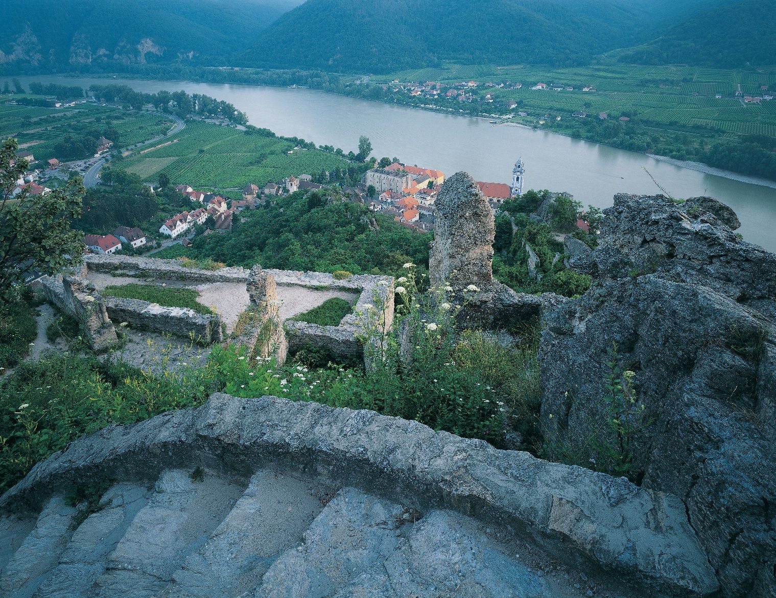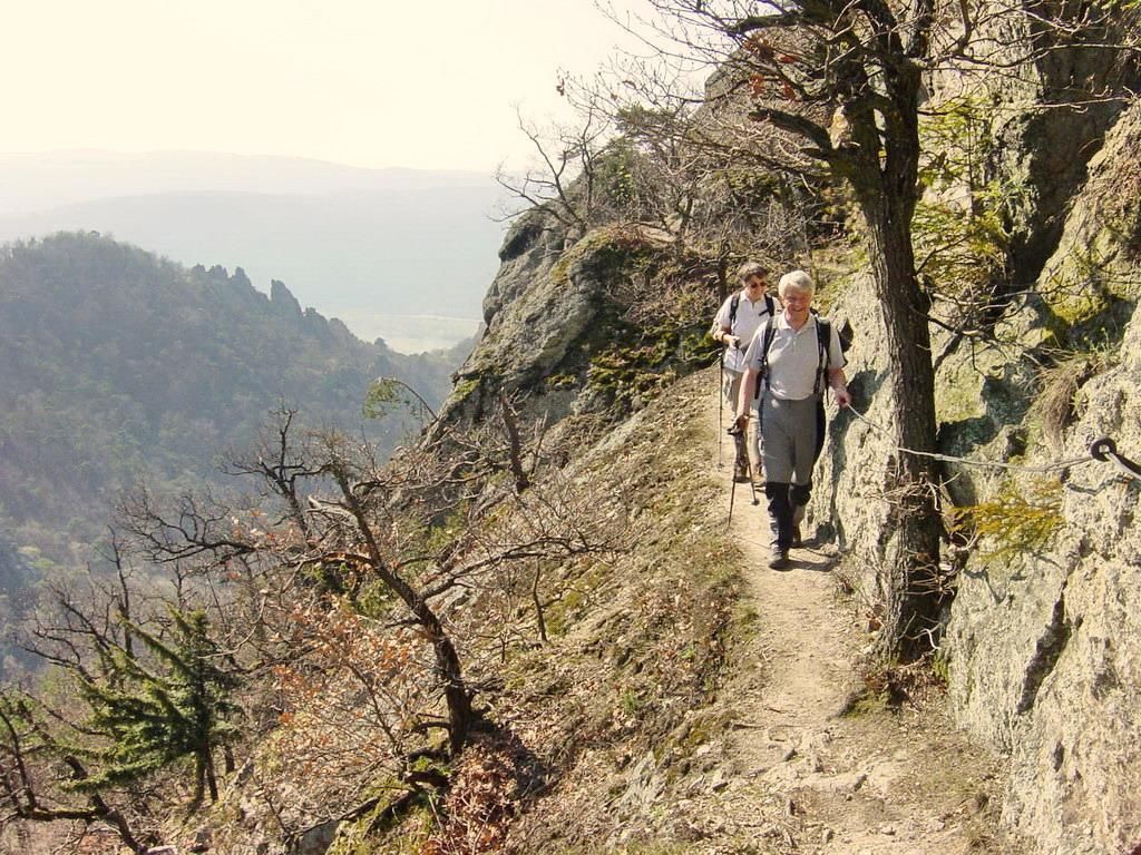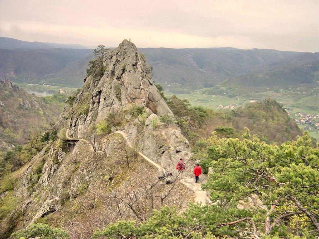 During the ascent, hikers enjoy an impressive panoramic view of Dürnstein and the surrounding landscape. Notable viewpoints are the projecting rocky ledge of the Vogelberg (546 m) and the Starhemberg watchtower (564 m) at the summit of Schlossberg. The key to the watchtower is available at the Fesslhütte.