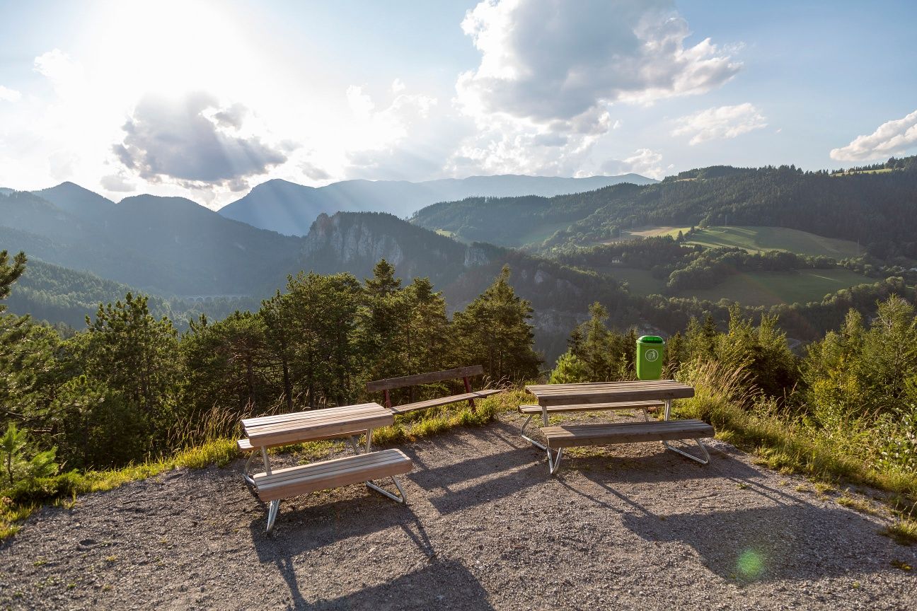 The Sonnwendstein stage starts at Feistritz Saddle, continuing over the summits of the Fanklbauerhöhe, Poirhöhe, and Alpkogel in the direction of Sonnwendstein. The Sonnwendstein has a very long, storied history and a unique, mystic aura. Its importance is due to the summer solstice, which is seen as a turning point and celebrated as such in many religions. During the summer solstice, religious and world festivals and rituals take place at the summit, such as the Johannisfeuer bonfire that is lit on the Sonnwendstein summit every year. The highlight is the Sonnwendstein vantage point.