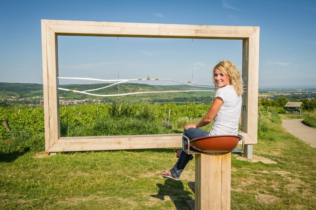 The wine-growing themes are supported by sometimes spectacular objects and sculptures: for example, a meter-long earthworm drills through the vineyard and accompanies the topic of soil cultivation, a giant sparkling wine shaker turns into a viewing platform, a swing invites weather observation, and much more.