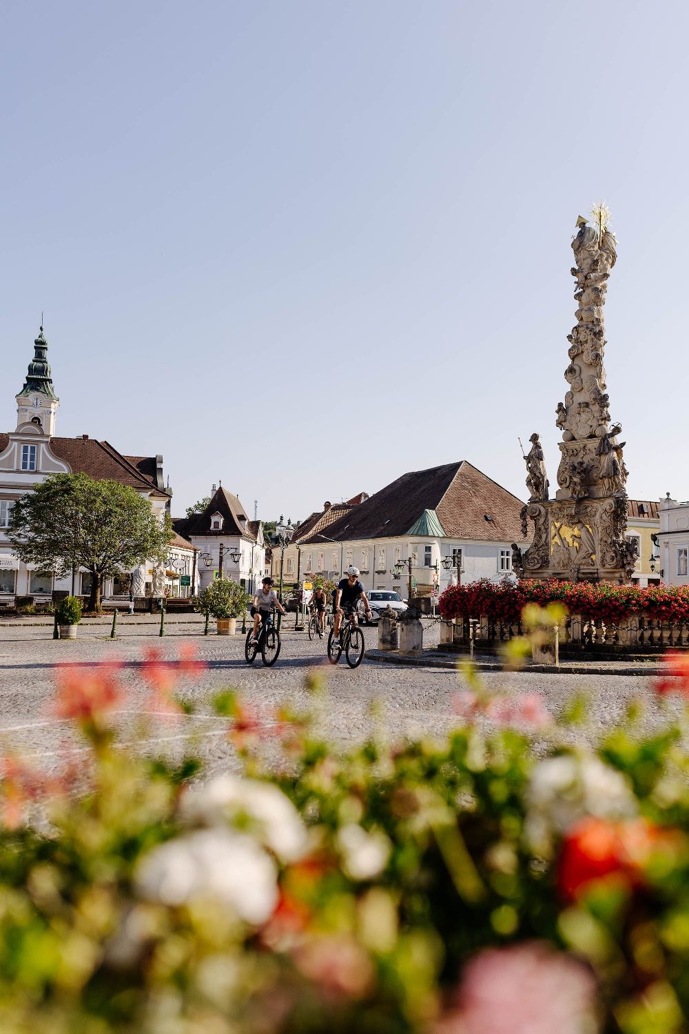 This varied walking route takes you on a journey of discovery through the picturesque wine landscape and modern art installations. The starting point is Kornplatz, from where you make your way to Ursin Haus. This is where the ascent to the LOISIUM wine world begins, and up to the stone gate and the stone pentagon, from where the hike continues. You pass the Windharfe and soon reach the stations "Riesenrebschere", "Kreuzungslabor", "Lössportrait" and the "Riedenportrait". After a short section, you come to a striking sculpture that leads you to the viewing platform, from where you can enjoy a breathtaking view over the region. The hike continues with the "Riesenrüttelpult" and the "Seelenschaukel", which invite you to linger and enjoy. Continue to the weather swing before passing the "giant earthworm" - an artistic installation that takes up the theme of nature.