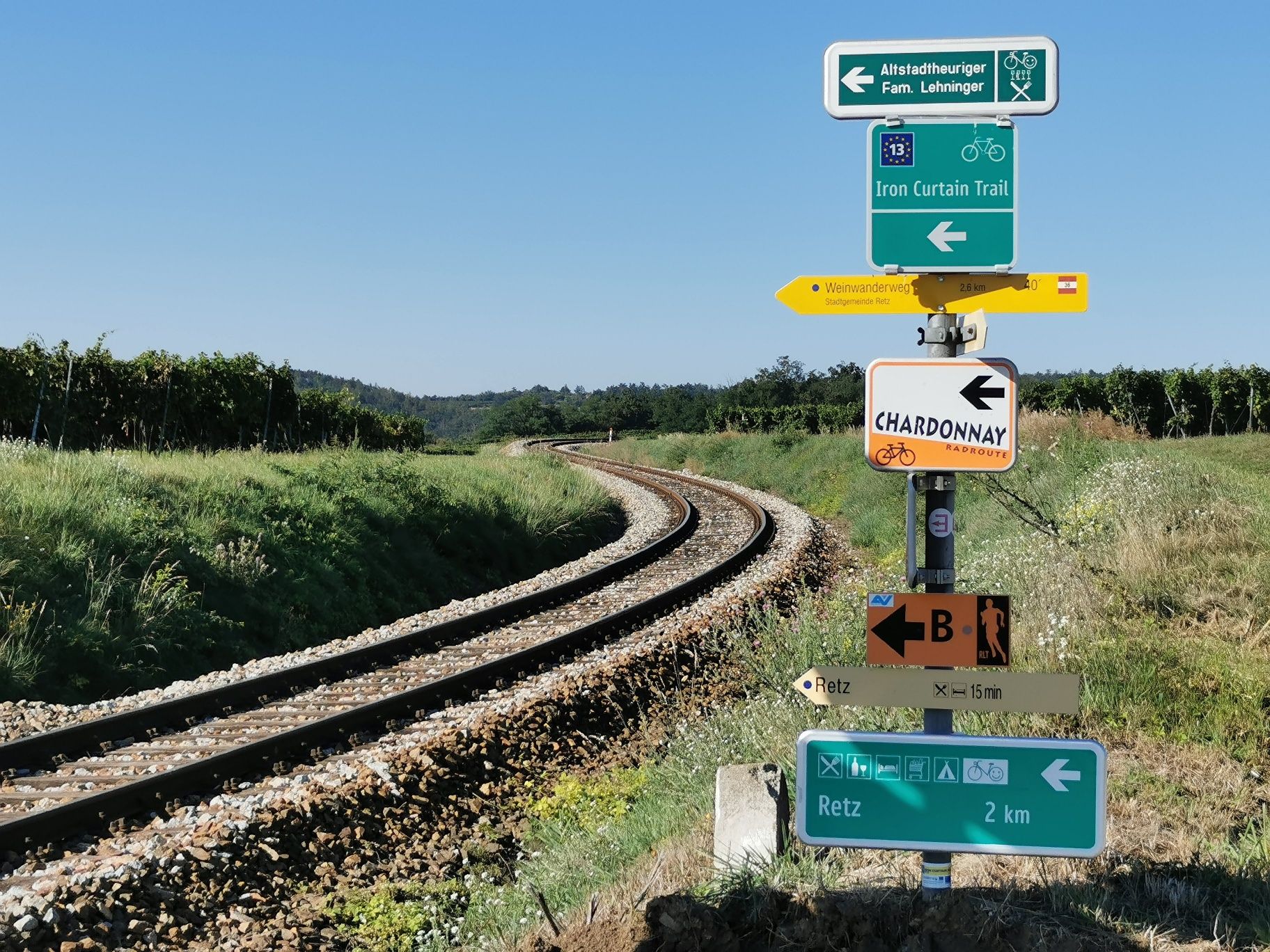 We leave the Main Square – town fountain – through the Verderber and Znaimer Gate. At the junction in front of us is a fork; we take the left – into Fladnitzerstraße – towards Hardegg. After about 200 m we turn right into the rural shopping street Lange Zeile. At the end of Lange Zeile begins the Wine Hiking Trail, which takes us through rolling vineyards, past a varietal wine garden, up to Altenberg. Past the Winemaker’s House at Altenberg, towards the railway crossing, turn right, we hike along the Setzberg back to the town. The path leads into Lange Zeile, where the Old Town tavern (Fam. Lehninger, Lange Zeile No.33) invites you to stop for a drink.