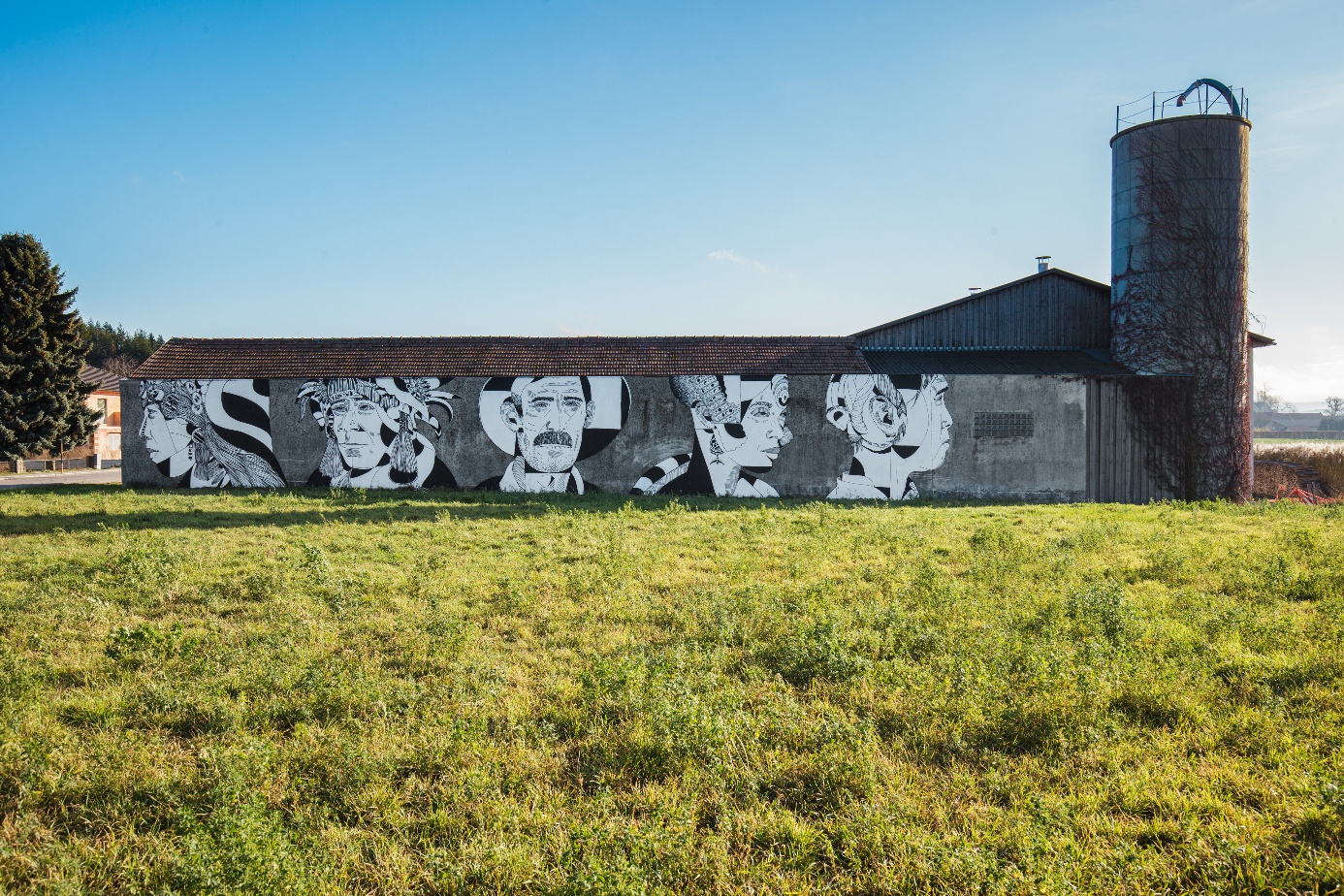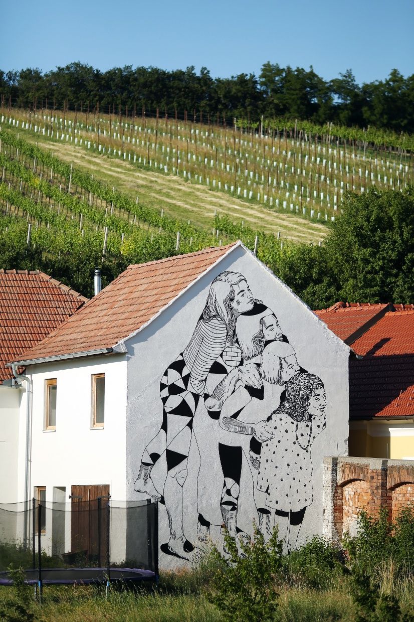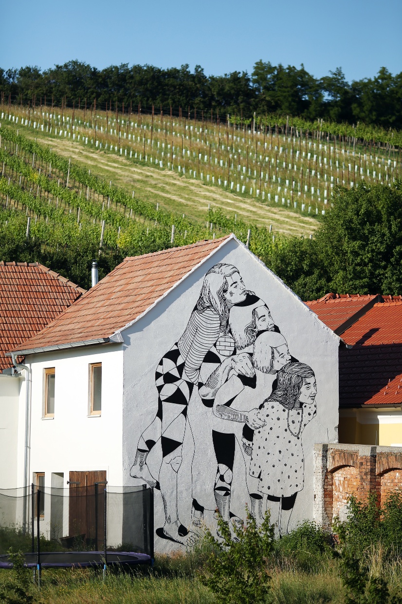 Katharina C. Herzog and David Leitner initiated the repeatedly awarded art project Würmlas Wände – urban art on rural facades in the market town of Würmla (district of Tulln) in Lower Austria in 2019. The motifs were created in cooperation with the owners of the walls and tell personal stories about the villagers of Würmla: their life in the countryside, their wishes and concerns, what occupies and moves them.