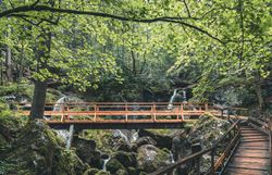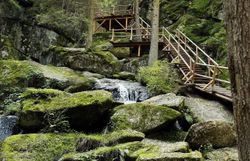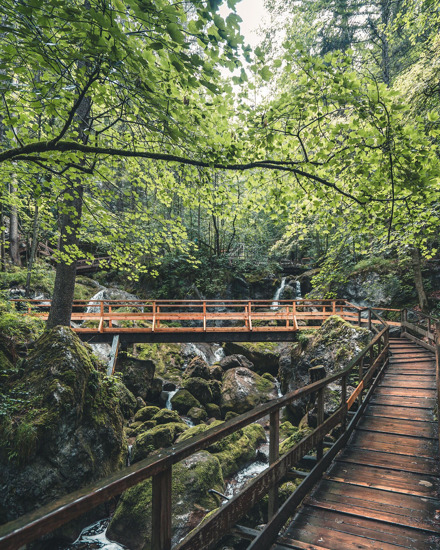 Surrounded by footbridges, rocky niches and mossy shade, an impressive natural spectacle unfolds around the Treffling Falls.