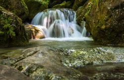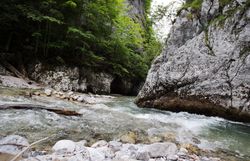Hidden in a wooded gorge near Puchberg, the Sebastianbach creek rushes over rocks into the depths.