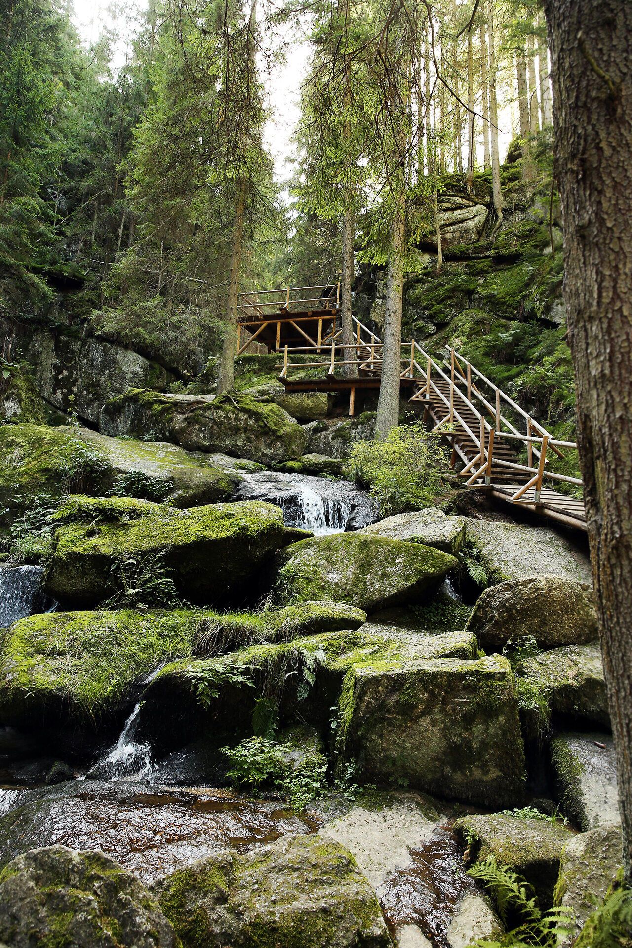 Between ancient forests and mossy rocks, streams meander through granite gorges. Here the water does not flow loudly, but constantly over cascades and under boulders.